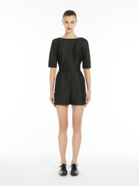 DETAILS Short-sleeved jumpsuit made of exquisite silk blend shantung. Semi-lined model featuring short shorts with wide leg and slant pockets on the sides. Boat neckline and bare back framed by crossed straps. The silhouette is highlighted by the high waistband and light tucks on the front. Invisible zip fastening on the back. COMPOSITION AND CARE Fabric 56% silk, 44% cotton; lining 85% acetate, 10% silk, 5% polyamide. Do not wash; do not bleach; do not tumble dry; cool iron; professionally dry clean perchloroethylene - mild process; do not wet clean.; wash the garment while it is fastened.; protect buttons before washing.; contains non-textile parts of animal origin. Distributed by Max Mara S.r.l., registered office in Reggio Emilia (Italy), Via Giulia Maramotti 4, 42124 (IT)