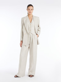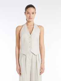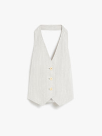 DETAILS Single-breasted waistcoat made of pure yarn-dyed linen Batavia, featuring a herringbone design. Unlined style featuring a classic V neck and bare back. Front fastening with three visible buttons. COMPOSITION AND CARE Fabric 100% flaxlinen; lining 100% flaxlinen. Machine wash cold delicate cycle; do not bleach; do not tumble dry; line drying in the shade; cool iron; professionally dry clean perchloroethylene - mild process.; do not iron the buttons.; protect buttons before washing.; contains non-textile parts of animal origin. Distributed by Max Mara S.r.l., registered office in Reggio Emilia (Italy), Via Giulia Maramotti 4, 42124 (IT)