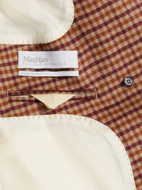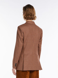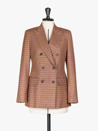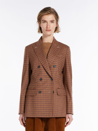 DETAILS Double breasted blazer in an exquisite wool and cashmere blend, designed with British style patterns. Light, soft touch Saxony fabric, enriched with a light elastic fibre that ensures absolute comfort and crease resistance performance. The full canvas construction has a peak lapel collar, a masculine breast pocket, three flap pockets on the front and vents on the back. Garment is lined in matching tone twill. Horn buttons. Length: 70 cm. COMPOSITION AND CARE Fabric 93% virgin wool, 6% cashmere, 1% elastane; lining 100% cupro; sleeves lining 65% viscose, 35% polyester. Do not wash; do not bleach; do not tumble dry; cool iron; professionally dry clean perchloroethylene - mild process; do not wet clean.; do not iron the buttons.; protect buttons before washing.; contains non-textile parts of animal origin. Distributed by Max Mara S.r.l., registered office in Reggio Emilia (Italy), Via Giulia Maramotti 4, 42124 (IT)