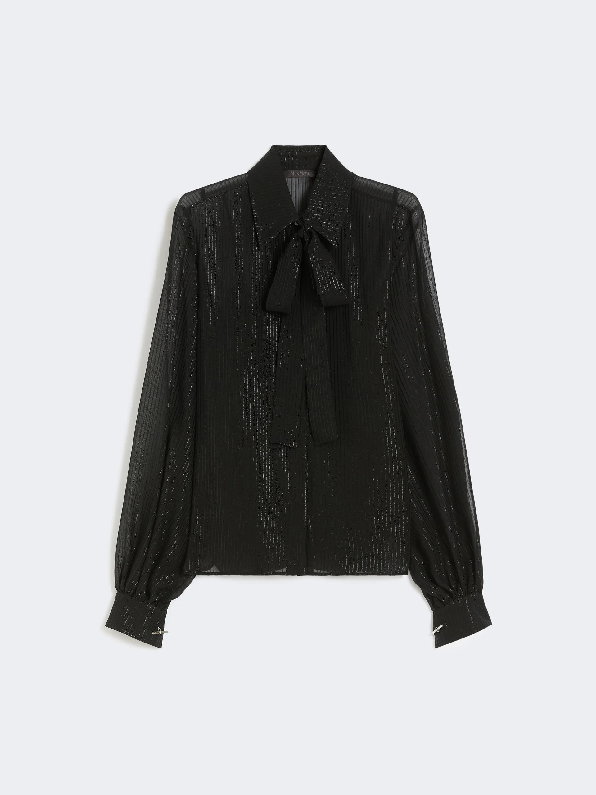 DETAILS Feminine blouse with removable bow tie at the front. Silk chiffon blouse with lame striped design Flowing style Shirt collar and wide jewel cufflink cuffs Relaxed fit long sleeves Front fastening with concealed mother-of-pearl buttons Rounded hem and side slits Matching slip top COMPOSITION AND CARE Shirt 92% silk, 8% nylon. Top 85% acetate, 10% silk, 5% polyamide. Shirt: do not wash; do not bleach; do not tumble dry; cool iron; professionally dry clean perchloroethylene - mild process; do not wet clean.; Wash the garment while it is fastened.; Turn the articles inside out before washing.; Remove the cufflinks before washing.; Contains non-textile parts of animal origin. Top: do not wash; do not bleach; do not tumble dry; cool iron; professionally dry clean perchloroethylene - mild process; do not wet clean. Distributed by Max Mara S.r.l., registered office in Reggio Emilia (Italy), Via Giulia Maramotti 4, 42124 (IT)