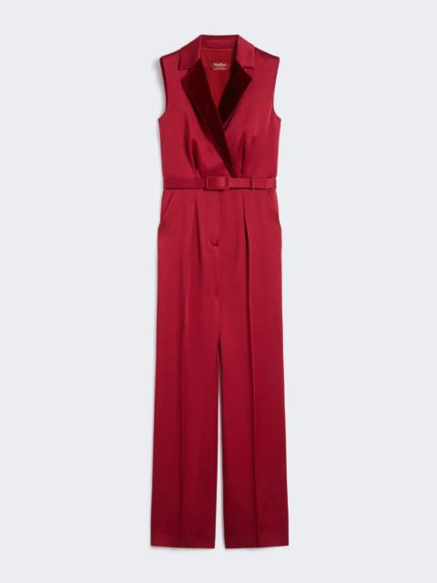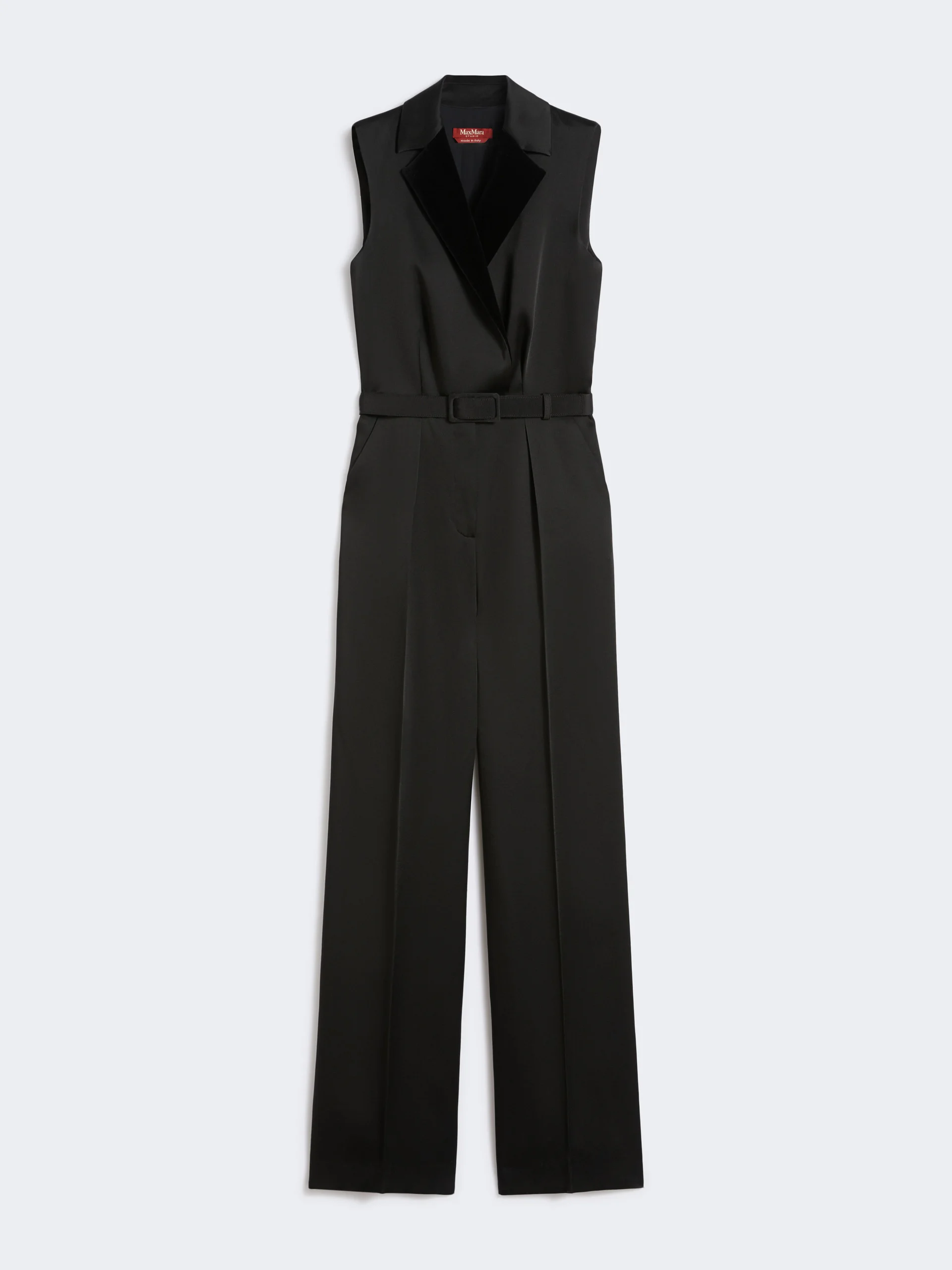 DETAILS Sophisticated tuxedo jumpsuit featuring a sleeveless bodice that defines the silhouette. The straight-leg trousers and the distinctive fabric finish create a glossy, striking visual effect. Jumpsuit in shiny washed crepe enver satin fabric Regular fit Criss-cross-front neckline with smooth velvet lapels Sleeveless bodice with matching waist belt Side slant pockets Pressed pleat detail and fully lined interior COMPOSITION AND CARE Fabric 71% acetate, 29% viscose; lining 85% acetate, 10% silk, 5% polyamide. Do not wash; do not bleach; do not tumble dry; cool iron; professionally dry clean perchloroethylene - mild process; do not wet clean.; wash the garment while it is fastened. Distributed by Max Mara S.r.l., registered office in Reggio Emilia (Italy), Via Giulia Maramotti 4, 42124 (IT)