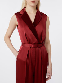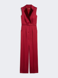 DETAILS Sophisticated tuxedo jumpsuit featuring a sleeveless bodice that defines the silhouette. The straight-leg trousers and the distinctive fabric finish create a glossy, striking visual effect. Jumpsuit in shiny washed crepe enver satin fabric Regular fit Criss-cross-front neckline with smooth velvet lapels Sleeveless bodice with matching waist belt Side slant pockets Pressed pleat detail and fully lined interior COMPOSITION AND CARE Fabric 71% acetate, 29% viscose; lining 85% acetate, 10% silk, 5% polyamide. Do not wash; do not bleach; do not tumble dry; cool iron; professionally dry clean perchloroethylene - mild process; do not wet clean.; wash the garment while it is fastened. Distributed by Max Mara S.r.l., registered office in Reggio Emilia (Italy), Via Giulia Maramotti 4, 42124 (IT)
