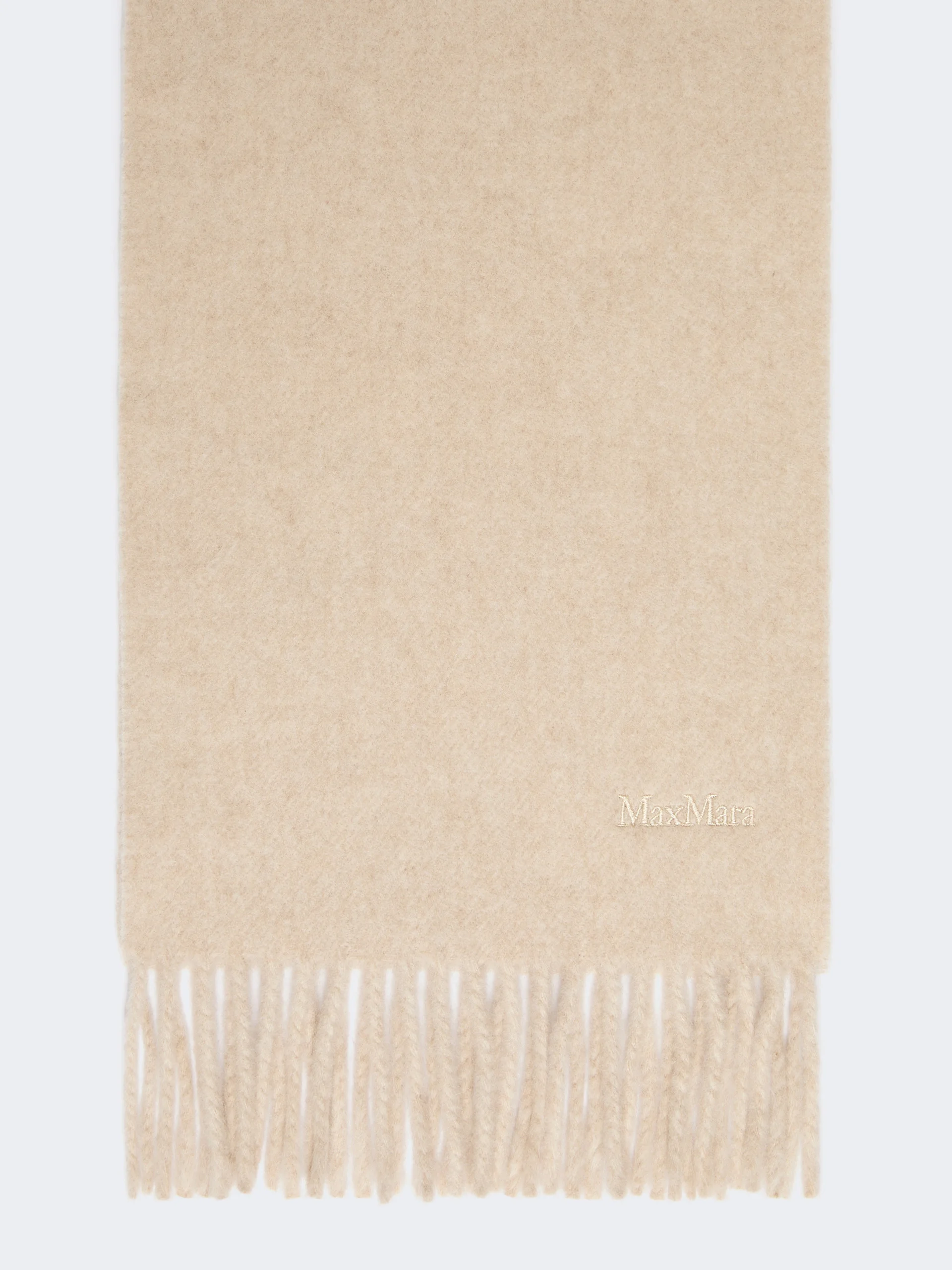 DETAILS Warm and enveloping monochrome scarf featuring tone-on-tone embroidered Max Mara lettering detail at the hem. Yarn-dyed pure wool scarf Fringed shorter sides Size: 25 x 208 cm COMPOSITION AND CARE 100% wool. Do not wash; do not bleach; do not tumble dry; cool iron; professionally dry clean perchloroethylene - mild process; do not wet clean. Distributed by Max Mara S.r.l., registered office in Reggio Emilia (Italy), Via Giulia Maramotti 4, 42124 (IT)