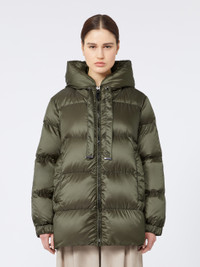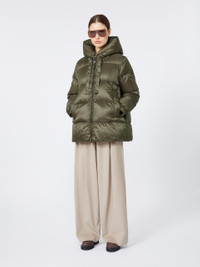 DETAILS Short, slightly oversized down jacket with an all-over quilted pattern in horizontal stripes. Down jacket in water-repellent canvas Drawstring hood Long sleeves with elastic cuffs Front zip fastening with leather zip-pull Welt pockets on the sides Goose-down padding COMPOSITION AND CARE Fabric 100% polyester; lining 100% polyester; with quilting virgin goose-down. Machine wash cold delicate cycle; do not bleach; do not tumble dry; line drying in the shade; cool iron; professionally dry clean perchloroethylene - mild process.; wash the garment while it is fastened.; don’t iron the labels.; protect the ends stoppers and/or the cord ends before washing.; turn the articles inside out before washing.; take off the zip tongue before washing.; contains non-textile parts of animal origin. Distributed by Max Mara S.r.l., registered office in Reggio Emilia (Italy), Via Giulia Maramotti 4, 42124 (IT)