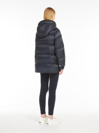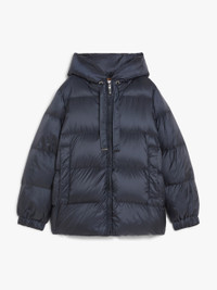 DETAILS Short, slightly oversized down jacket with an all-over quilted pattern in horizontal stripes. Water-repellent technical canvas down jacket Drawstring hood Long sleeves with elastic cuffs Front zip fastening with leather zip-pull Welt pockets on the sides Goose-down padding COMPOSITION AND CARE Fabric 100% polyester; lining 100% polyester; with quilting virgin goose-down. Machine wash cold delicate cycle; do not bleach; do not tumble dry; line drying in the shade; cool iron; professionally dry clean perchloroethylene - mild process.; wash the garment while it is fastened.; don’t iron the labels.; protect the ends stoppers and/or the cord ends before washing.; turn the articles inside out before washing.; take off the zip tongue before washing.; contains non-textile parts of animal origin. Distributed by Max Mara S.r.l., registered office in Reggio Emilia (Italy), Via Giulia Maramotti 4, 42124 (IT)
