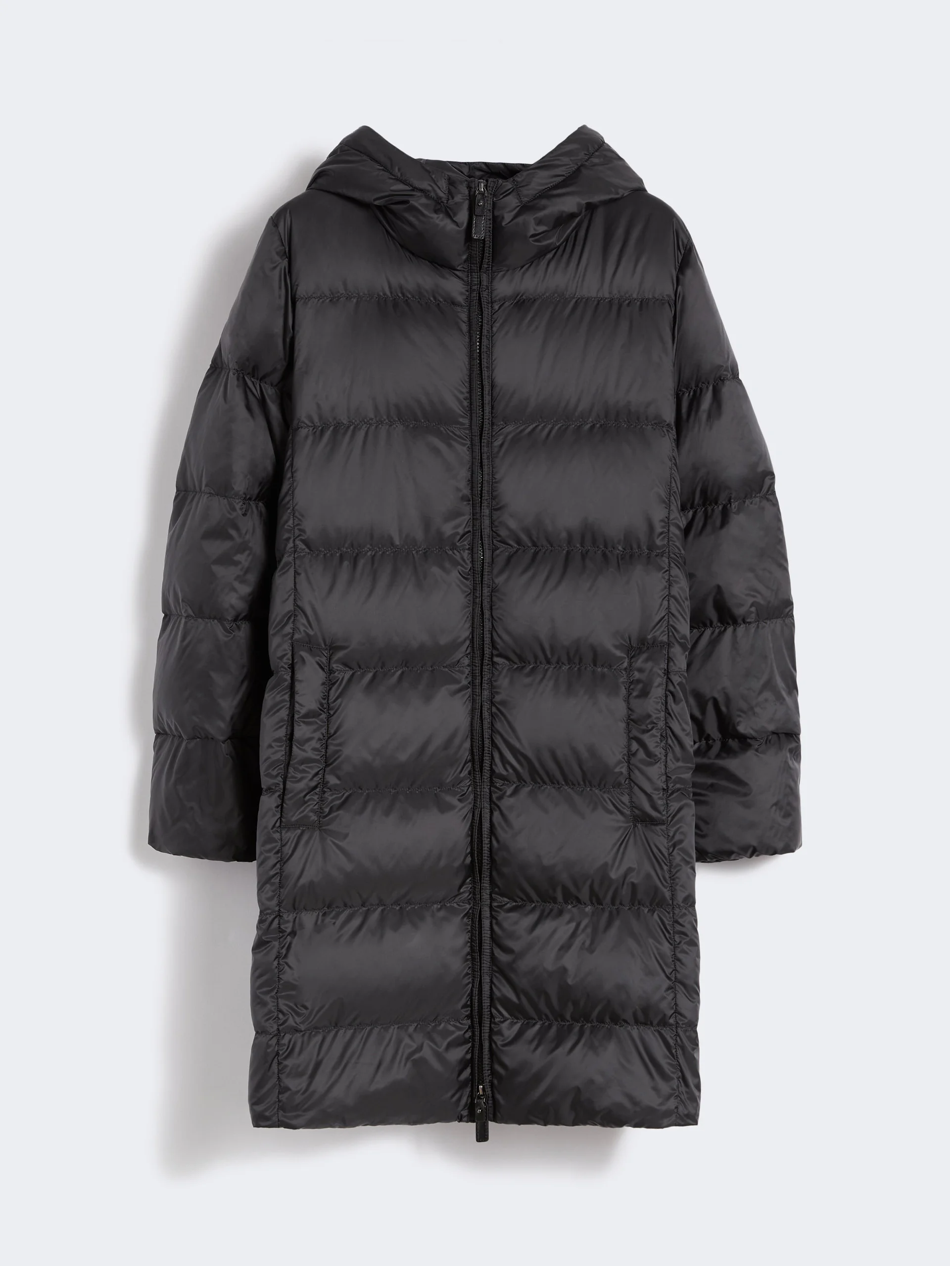 DETAILS Midi down jacket featuring a straight silhouette with an elasticated waist at the back. Water-repellent technical canvas down jacket with horizontal striped quilting Hood and long sleeves Front fastening with double slider zip Welt pockets with snap buttons Matching elasticated webbing belt with metal snap-clip buckle Goose-down padding COMPOSITION AND CARE Quilted coat fabric 100% polyester; lining 100% polyester; with quilting virgin goose-down; with belt in 80% polyester, 20% elastodiene; with belt in cattle. Quilted coat: machine wash cold delicate cycle; do not bleach; do not tumble dry; line drying in the shade; cool iron; professionally dry clean perchloroethylene - mild process.; Wash the garment while it is fastened.; Don’t iron the labels.; Take off the zip tongue before washing.; Contains non-textile parts of animal origin. Belt: do not wash; do not bleach; do not tumble dry; do not iron; do not dry clean; do not wet clean. Distributed by Max Mara S.r.l., registered office in Reggio Emilia (Italy), Via Giulia Maramotti 4, 42124 (IT)