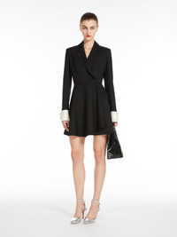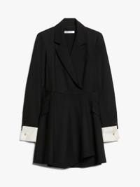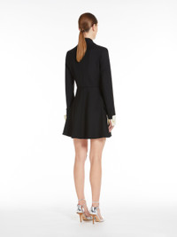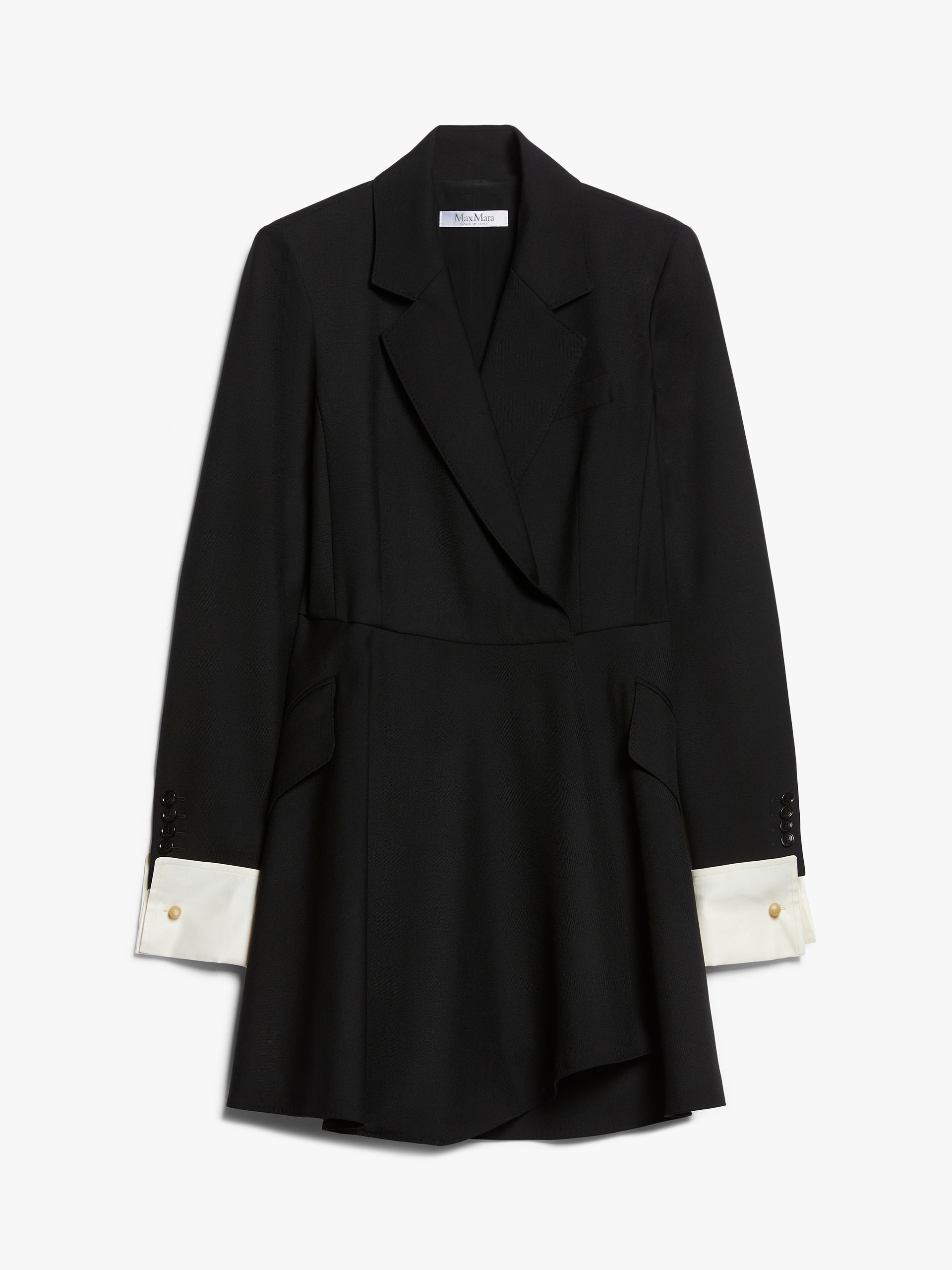 DETAILS Short shirt dress made of luxurious pure wool fabric. Semi-lined couture-inspired garment featuring a feminine silhouette with waist seam, flared wrap skirt and long sleeves with removable cuff in contrasting cotton satin, trompe l’oeil effect, and cufflink button. Chest pocket and pockets with slanted flap on the front. Concealed snap-button fastening. COMPOSITION AND CARE Fabric 100% virgin wool; fabric 2 100% cotton; lining 95% acetate, 5% elastane. Do not wash; do not bleach; do not tumble dry; cool iron; professionally dry clean perchloroethylene - mild process; do not wet clean.; do not iron the buttons.; protect buttons before washing.; remove the cufflinks before washing.; contains non-textile parts of animal origin. Distributed by Max Mara S.r.l., registered office in Reggio Emilia (Italy), Via Giulia Maramotti 4, 42124 (IT)