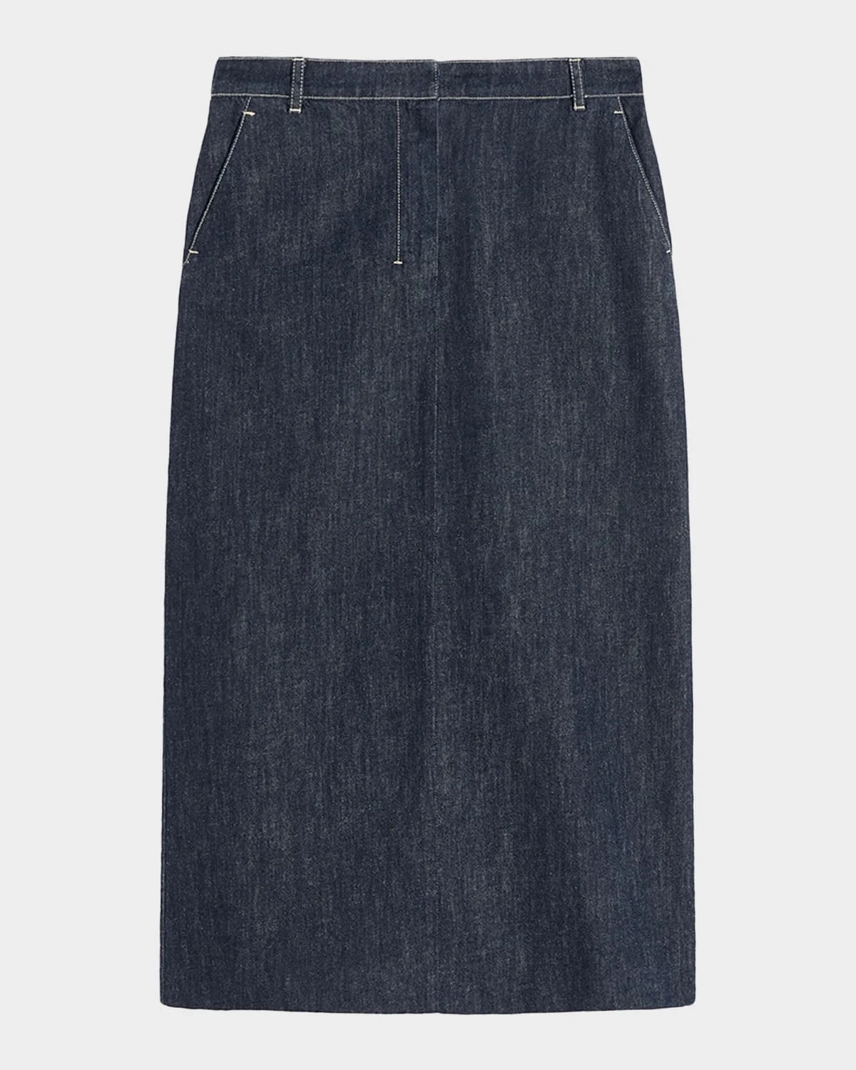 Crafted from dark-washed denim, the "Serena" skirt & nbsp;from Max Mara features contrast topstitching and a logo leather patch on the back of the waist High waist Angled side sip pockets Skirt falls straight from hip to hem Hem falls below the knee Center-back walking vent Hook/zip fly; belt loops Cotton Machine wash cold Made in Morocco SIZE & FITModel measurements: 5 & apos;10" tallModel is wearing a US size 4/Small