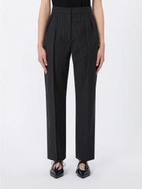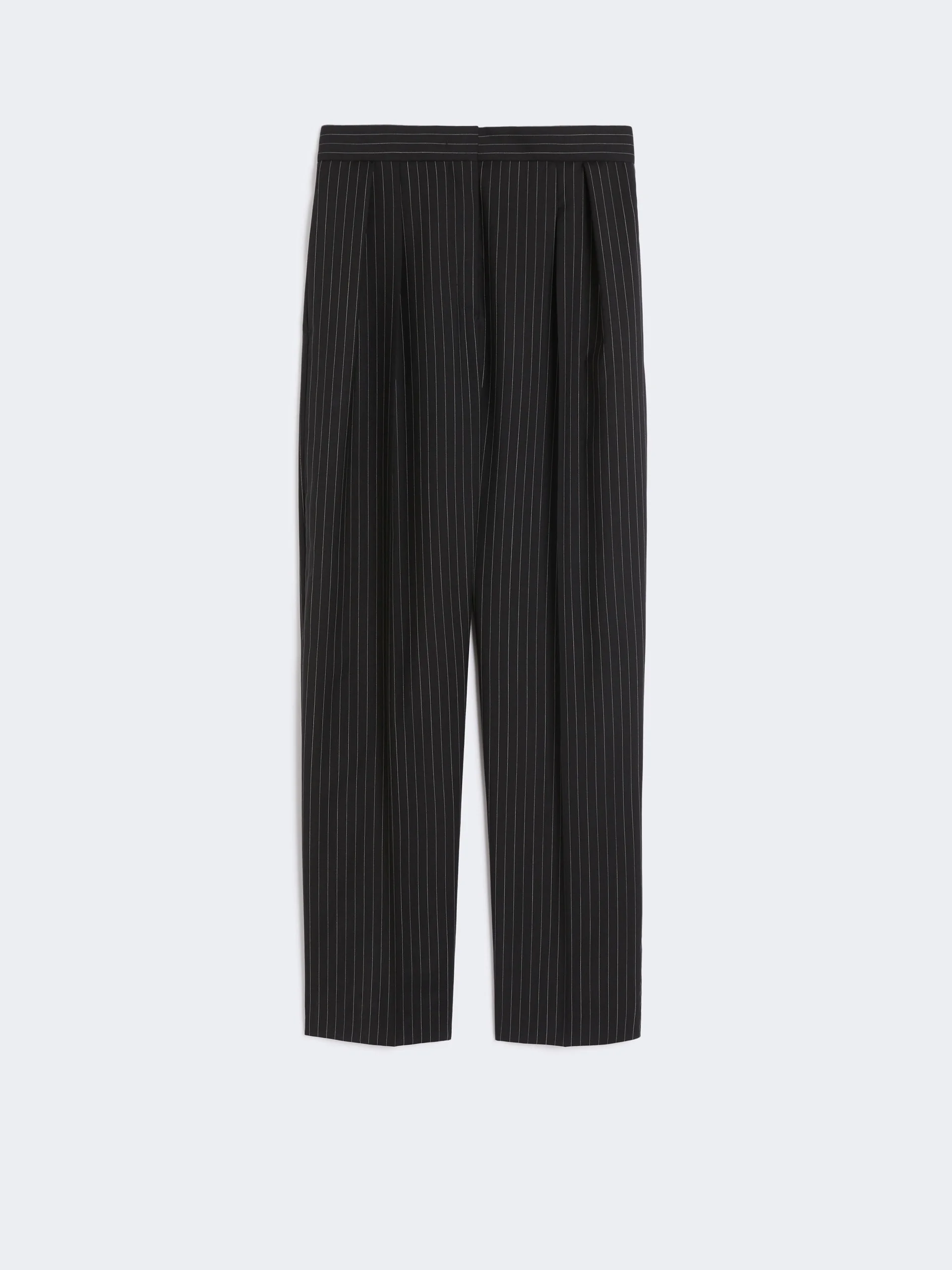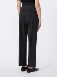 DETAILS Carrot-fit trousers cropped above the ankle. - Lightweight pure wool canvas pinstriped trousers - Slightly loose fit on the hips that tapers at the hem - Fastening with a wide waistband tab, zip fly and small hook - Inset pockets at the sides and welt pockets at the back - Double waist pleats on the front - Trouser crease and darts sewn at the waist back COMPOSITION AND CARE 100% virgin wool. Machine wash cold delicate cycle; do not bleach; do not tumble dry; line drying in the shade; cool iron; professionally dry clean perchloroethylene - mild process.; protect buttons before washing. Distributed by Max Mara S.r.l., registered office in Reggio Emilia (Italy), Via Giulia Maramotti 4, 42124 (IT)