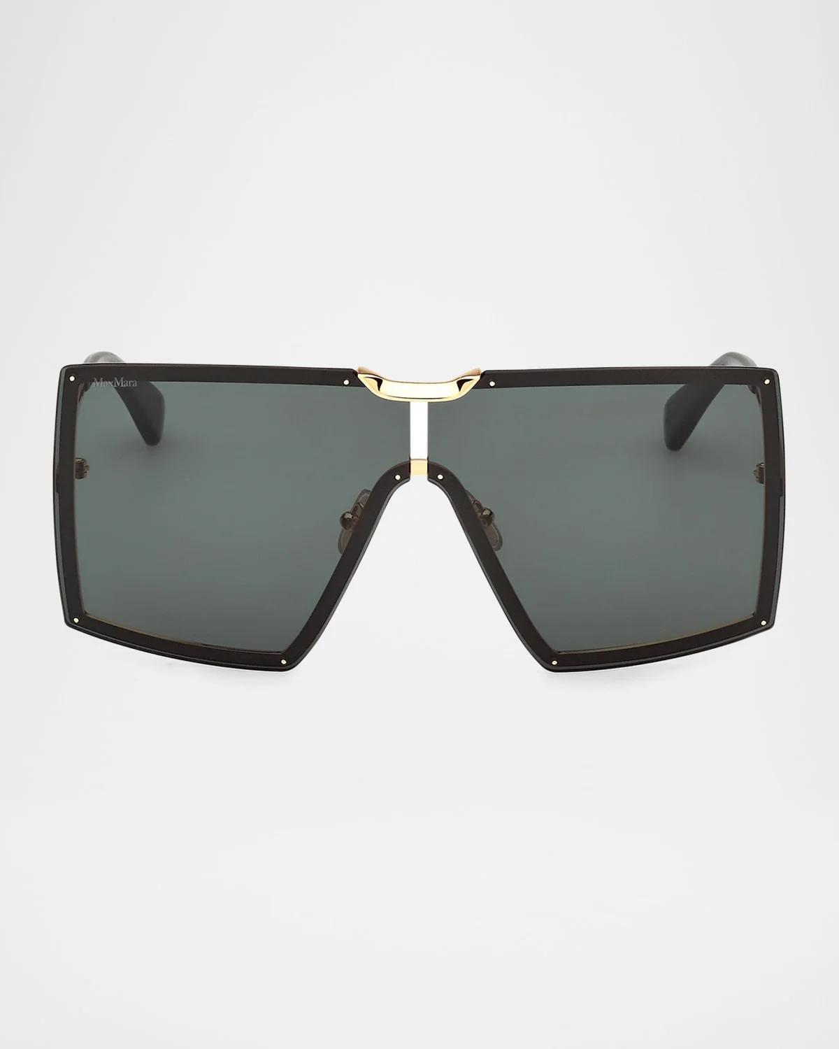 - Max Mara shield sunglasses in metal - Eye/bridge/temple (in mm): 69-3-135 - Solid-color lenses - Adjustable nose pads - Logo engraved at temples - Thin, tapered arms - Capped earpieces - Metal - Spot clean - 100% UVA/UVB protection - Imported - Proposition 65 warning for California residents