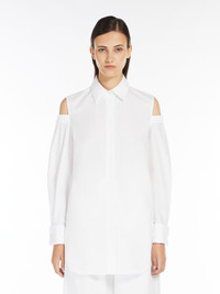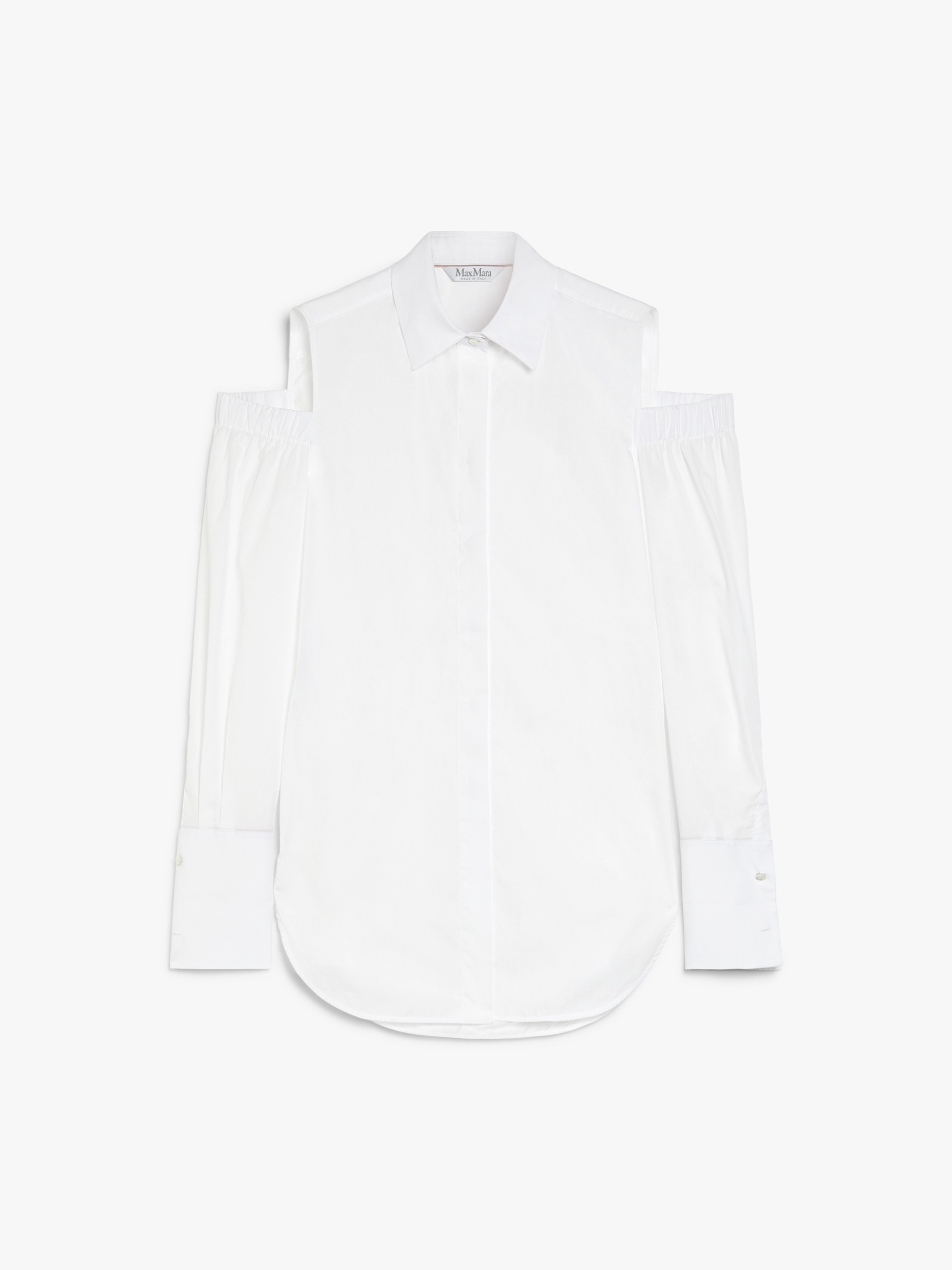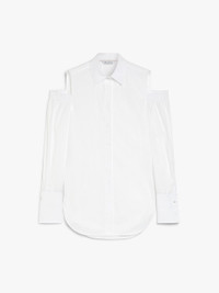 DETAILS Menswear long shirt made of stretch cotton poplin. Straight-cut style featuring long sleeves with stretch cut-out detail gathered at the shoulder, pointed collar and high cufflink cuffs. Asymmetrical hem, slightly longer at the back and rounded side slits. Concealed button fastening. COMPOSITION AND CARE 100% cotton. Machine wash cold delicate cycle; do not bleach; do not tumble dry; line drying in the shade; cool iron; professionally dry clean perchloroethylene - mild process.; wash the garment while it is fastened.; do not iron the buttons.; turn the articles inside out before washing.; remove the cufflinks before washing.; contains non-textile parts of animal origin. Distributed by Max Mara S.r.l., registered office in Reggio Emilia (Italy), Via Giulia Maramotti 4, 42124 (IT)