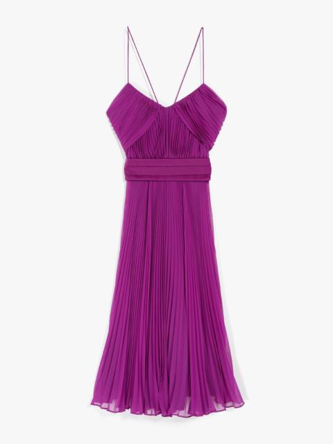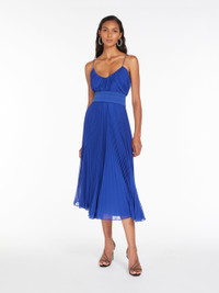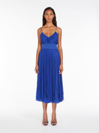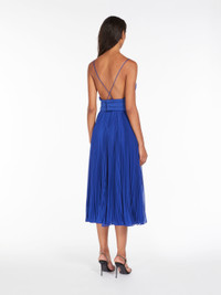 DETAILS Midi dress in pleated fabric enhanced by tuxedo-style details and a cross-over neckline at the back. Style with a couture-inspired large volume, accentuated by the pleated layered motif at the front and cummerbund at the waist in the same tones. Length: 125 cm. COMPOSITION AND CARE Fabric 100% polyester; lining 85% acetate, 10% silk, 5% nylon. Do not wash; do not bleach; do not tumble dry; cool iron; professionally dry clean perchloroethylene - mild process; do not wet clean. Distributed by Max Mara S.r.l., registered office in Reggio Emilia (Italy), Via Giulia Maramotti 4, 42124 (IT)