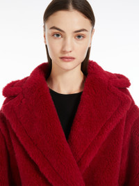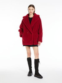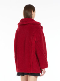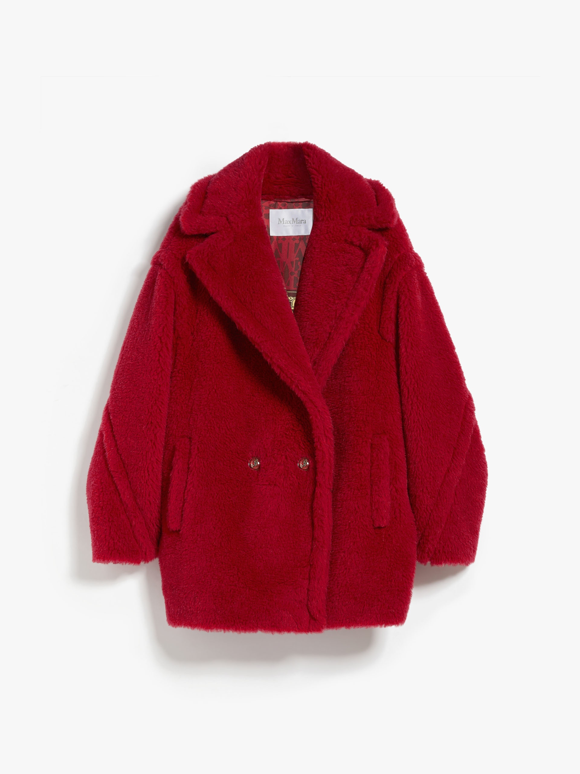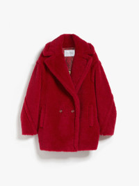 DETAILS Iconic Teddy coat in alpaca and wool on a silk base, available in a new short, above-the-knee length version. The classic style’s oversized fit and details are repeated: large lapel collar, low-set sleeves and vertical welt pockets. Double-breasted style, closed with custom buttons. Style dedicated to the Chinese New Year, available in red and finished with a customised lining with a jacquard monogram design and small, gold-coloured dragons COMPOSITION AND CARE Jersey fabric 62% alpaca, 26% virgin wool, 12% silk; lining 100% silk. Do not wash; do not bleach; do not tumble dry; do not iron; professionally dry clean perchloroethylene - mild process; do not wet clean.; protect buttons before washing.; contains non-textile parts of animal origin. Distributed by Max Mara S.r.l., registered office in Reggio Emilia (Italy), Via Giulia Maramotti 4, 42124 (IT)