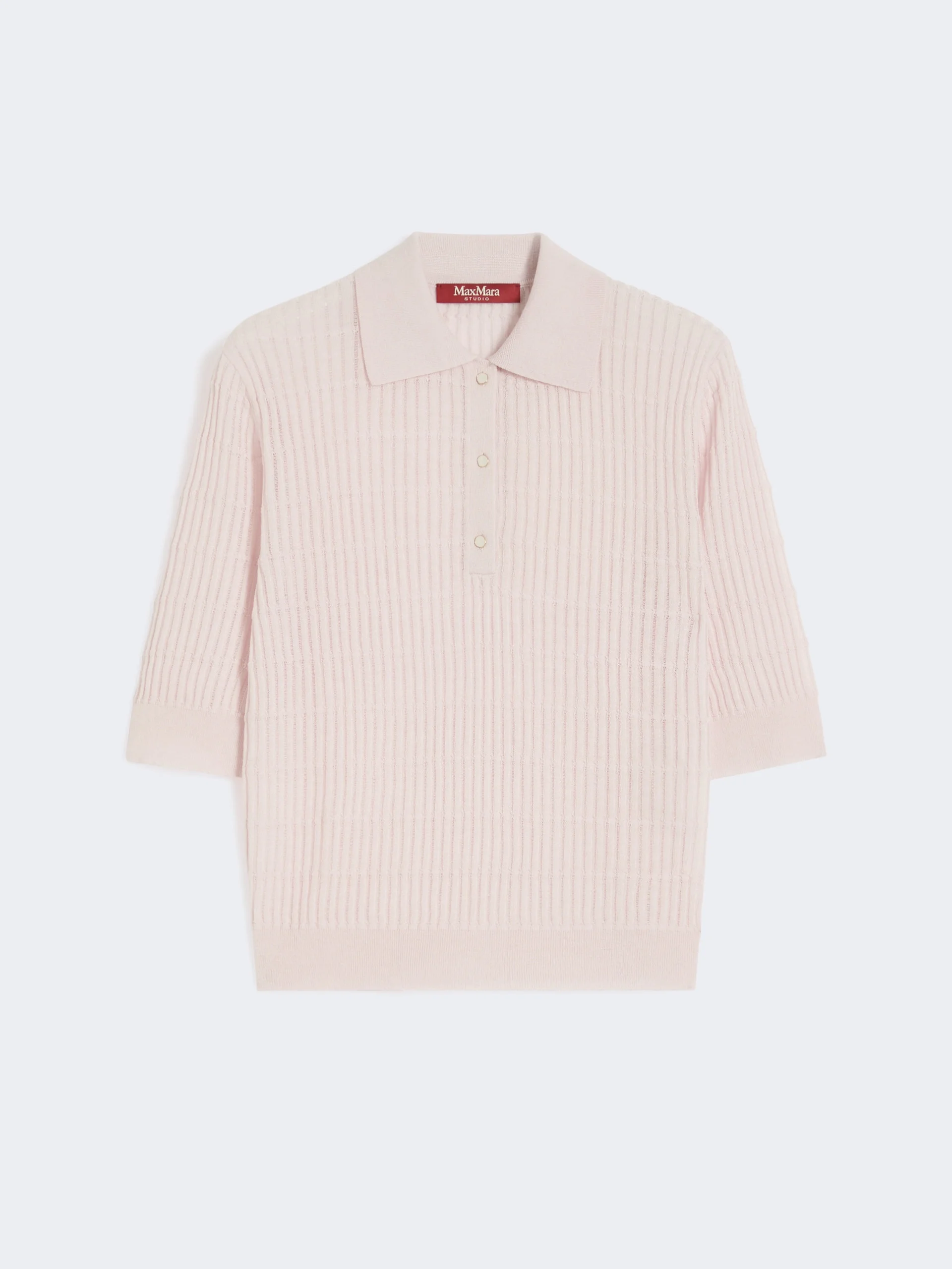 DETAILS Flat rib-knit polo sweater featuring openwork details. - Wool and silk yarn polo shirt - Feminine fit - The collar fastens by means of metal buttons with a tonal enamel interior - Elbow-length set-in sleeves - Straight hem COMPOSITION AND CARE 55% silk, 45% wool. Hand wash cold (40°c max); do not bleach; do not tumble dry; flat drying in the shade; cool iron; professionally dry clean perchloroethylene - mild process; do not wet clean.; iron with a cloth between.; using neutral detergent. Distributed by Max Mara S.r.l., registered office in Reggio Emilia (Italy), Via Giulia Maramotti 4, 42124 (IT) Collection: Studio Product code: 6361056106002 - MSTGALLO