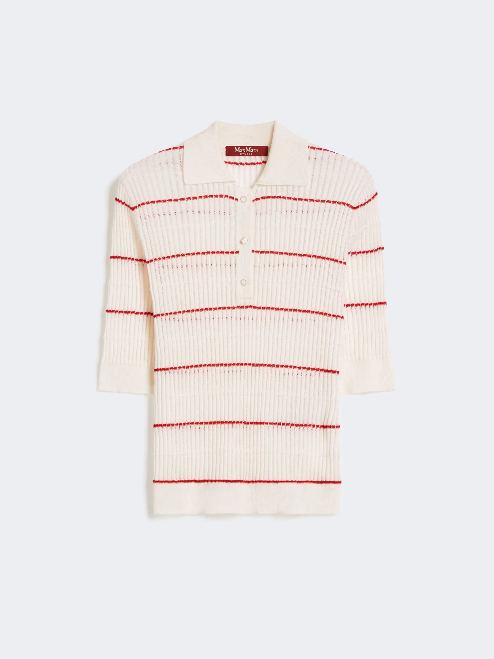 DETAILS Flat rib-knit polo sweater featuring openwork details. - Wool and silk yarn polo shirt - Feminine fit - The collar fastens by means of metal buttons with a tonal enamel interior - Elbow-length set-in sleeves - Straight hem COMPOSITION AND CARE 55% silk, 45% wool. Hand wash cold (40°c max); do not bleach; do not tumble dry; flat drying in the shade; cool iron; professionally dry clean perchloroethylene - mild process; do not wet clean.; iron with a cloth between.; using neutral detergent. Distributed by Max Mara S.r.l., registered office in Reggio Emilia (Italy), Via Giulia Maramotti 4, 42124 (IT) Collection: Studio Product code: 6361056106012 - MSTGALLO