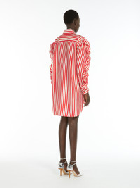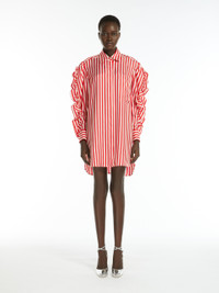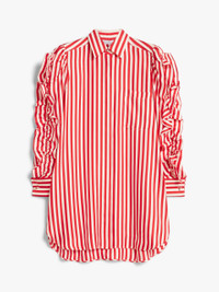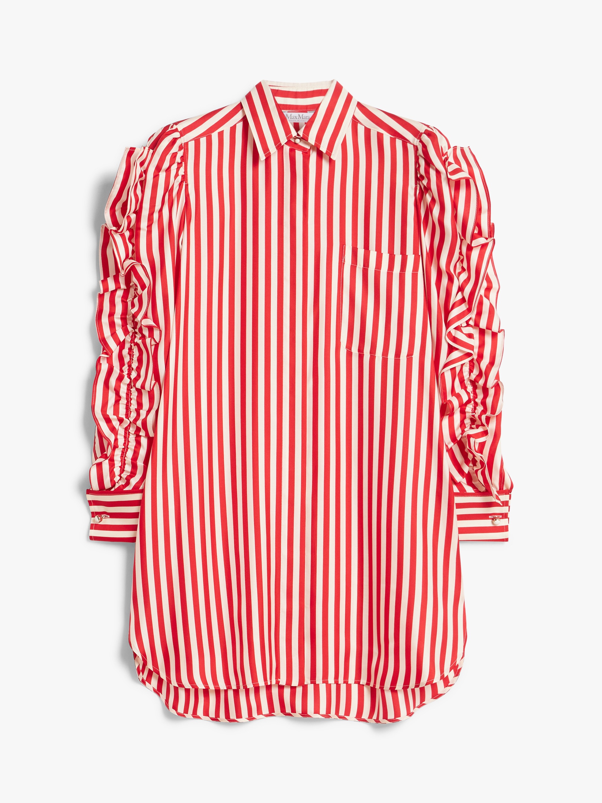 DETAILS Short shirt dress made of exquisite pure silk striped fabric. Unlined garment featuring long sleeves with a gathered pattern on the shoulders and side ruffles applied along the entire length. Finished with patch pocket on the chest, yoke seam with pleats on the back, French cuff and rounded hem, longer on the back, with side slits. Concealed button fastening at the front. COMPOSITION AND CARE 100% silk. Do not wash; do not bleach; do not tumble dry; cool iron; professionally dry clean perchloroethylene - mild process; do not wet clean.; wash the garment while it is fastened.; do not iron the buttons.; protect buttons before washing.; turn the articles inside out before washing.; remove the cufflinks before washing. Distributed by Max Mara S.r.l., registered office in Reggio Emilia (Italy), Via Giulia Maramotti 4, 42124 (IT)