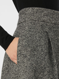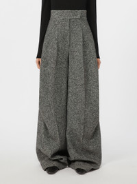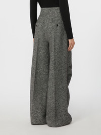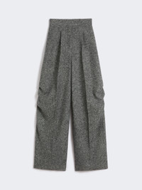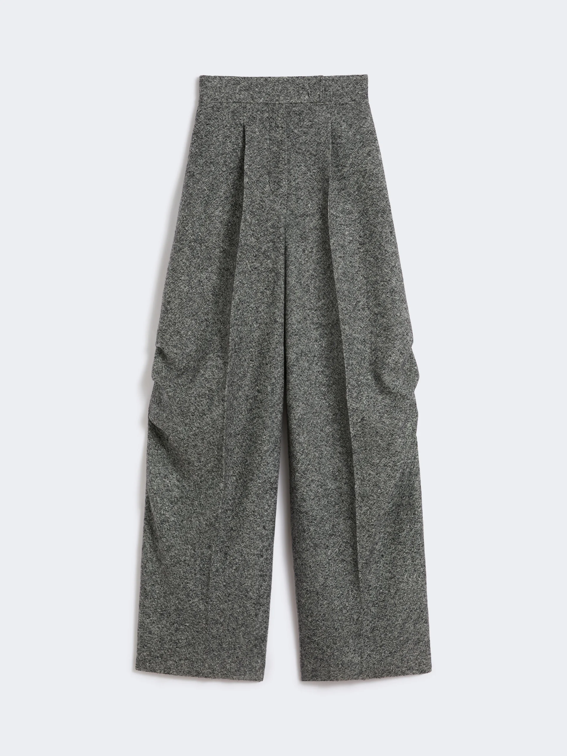 DETAILS Long trousers featuring a relaxed silhouette with a banana leg. Wool and silk tweed trousers High waist with front pleats and trouser crease Fastening with a wide waistband tab, zip fly and snap-buttons Side inset pockets Welt pockets with button at the back Pleated pattern on the side to knee height COMPOSITION AND CARE Outer fabric 70% virgin wool, 30% silk; inner fabric 100% polyester. Do not wash; do not bleach; do not tumble dry; cool iron; professionally dry clean perchloroethylene - mild process; do not wet clean.; wash the garment while it is fastened.; do not iron the buttons.; protect buttons before washing.; contains non-textile parts of animal origin. Distributed by Max Mara S.r.l., registered office in Reggio Emilia (Italy), Via Giulia Maramotti 4, 42124 (IT)