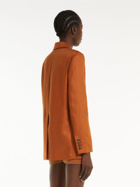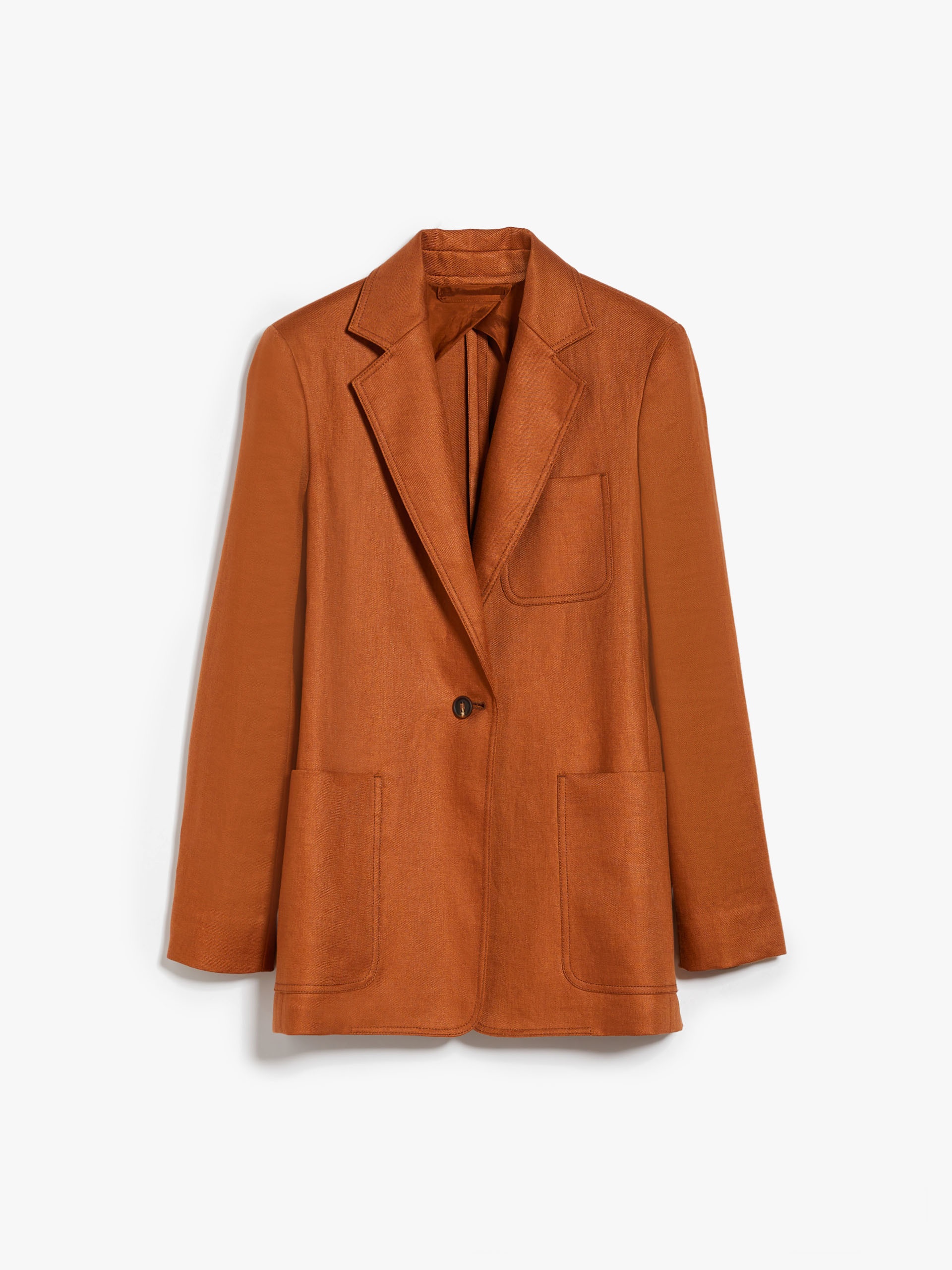 DETAILS Single-breasted blazer with a semi-fitted silhouette, made of pure linen twill fabric. Semi-lined style with a lapel collar, long, set-in sleeves and patch pockets on the front. Finished with a central vent at the back and a patch pocket on the chest on the left side. One-button closure. COMPOSITION AND CARE Fabric 100% flaxlinen; lining 56% viscose, 44% cotton. Do not wash; do not bleach; do not tumble dry; cool iron; professionally dry clean perchloroethylene - mild process; do not wet clean.; do not iron the buttons.; protect buttons before washing.; contains non-textile parts of animal origin. Distributed by Max Mara S.r.l., registered office in Reggio Emilia (Italy), Via Giulia Maramotti 4, 42124 (IT)