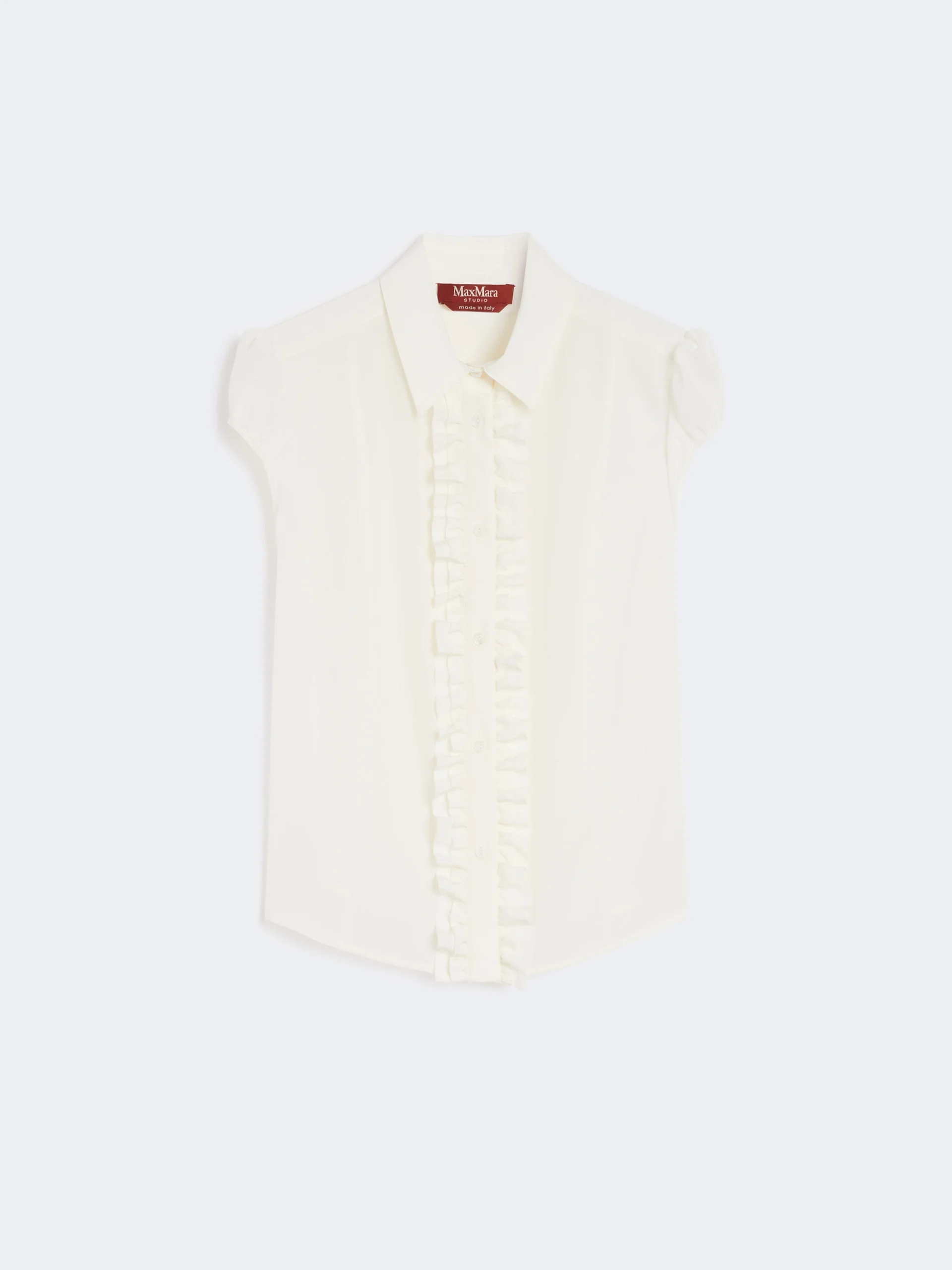 DETAILS Feminine-fit shirt featuring '40s-style details. Shirt in washed pure silk crepe de chine fabric Slim fit Classic pointed collar Puff cap sleeves Front button fastening Shirt-front detail with small ruches Rounded hem COMPOSITION AND CARE 100% silk. Hand wash cold (40°c max); do not bleach; do not tumble dry; line drying in the shade; cool iron; professionally dry clean perchloroethylene - mild process; do not wet clean.; wash the garment while it is fastened.; turn the articles inside out before washing.; contains non-textile parts of animal origin. Distributed by Max Mara S.r.l., registered office in Reggio Emilia (Italy), Via Giulia Maramotti 4, 42124 (IT)
