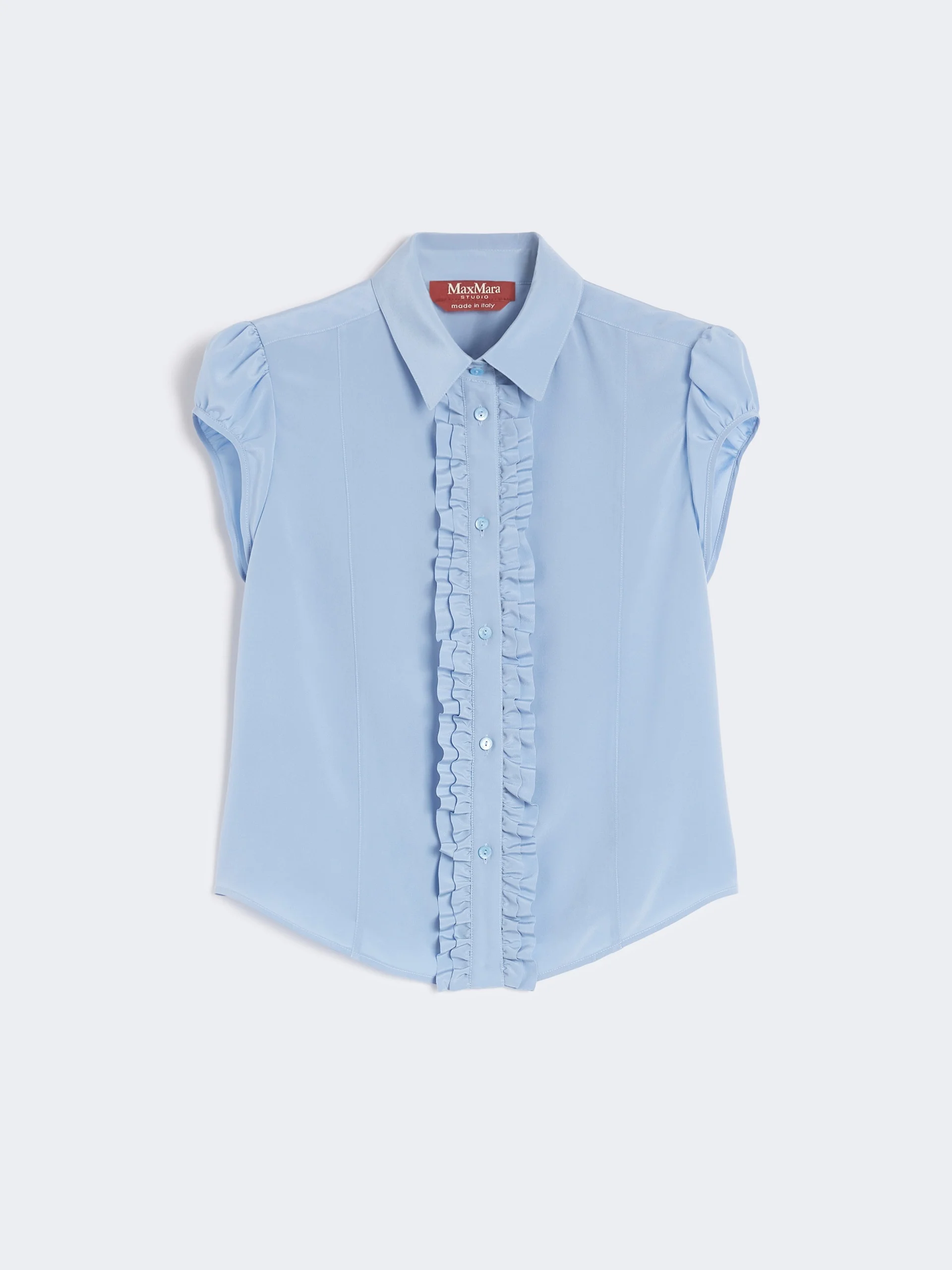 DETAILS Feminine-fit shirt featuring '40s-style details. Shirt in washed pure silk crepe de chine fabric Slim fit Classic pointed collar Puff cap sleeves Front button fastening Shirt-front detail with small ruches Rounded hem COMPOSITION AND CARE 100% silk. Hand wash cold (40°c max); do not bleach; do not tumble dry; line drying in the shade; cool iron; professionally dry clean perchloroethylene - mild process; do not wet clean.; wash the garment while it is fastened.; turn the articles inside out before washing.; contains non-textile parts of animal origin. Distributed by Max Mara S.r.l., registered office in Reggio Emilia (Italy), Via Giulia Maramotti 4, 42124 (IT)