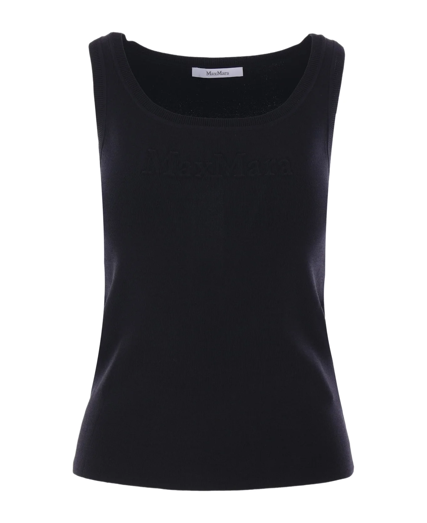 Max Mara tank top made from black ribbed knit, decorated with the iconic raised logo lettering on the chest. It features a wide neckline and a straight hem. Composition: 65% viscose, 35% polyamide Made in: China Color: BLACK Size and fit: - Slim Fit Model number: 2511361049600036004