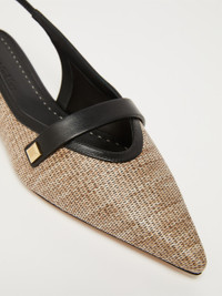 DETAILS Flat sandals made of raffia-effect fabric with a smooth texture. The slingback design with tapered toe features a strap on the instep, with square Max Mara logo detail on the side, and a slightly square heel. Finished with satin lining and leather insole with tailor’s pick stitch. Natural pumiced leather sole and 1.5 cm monobloc heel. COMPOSITION AND CARE Upper in 60% polyamide, 40% polyester; lining in 72% viscose, 28% silk; sole in leather. Distributed by Max Mara S.r.l., registered office in Reggio Emilia (Italy), Via Giulia Maramotti 4, 42124 (IT)