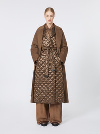 DETAILS Long down jacket with robe silhouette and matching belt at the waist. Water-repellent, iridescent nylon canvas diamond-quilted down jacket Lapel collar Long sleeves with slit at the hem Belt fastening Welt pockets on the sides Goose-down padding COMPOSITION AND CARE Fabric 100% polyamide; lining 100% polyamide; with quilting virgin goose-down. Do not wash; do not bleach; do not tumble dry; cool iron; professionally dry clean perchloroethylene - mild process; do not wet clean.; don’t iron the labels.; remove the belt before washing.; contains non-textile parts of animal origin. Distributed by Max Mara S.r.l., registered office in Reggio Emilia (Italy), Via Giulia Maramotti 4, 42124 (IT)
