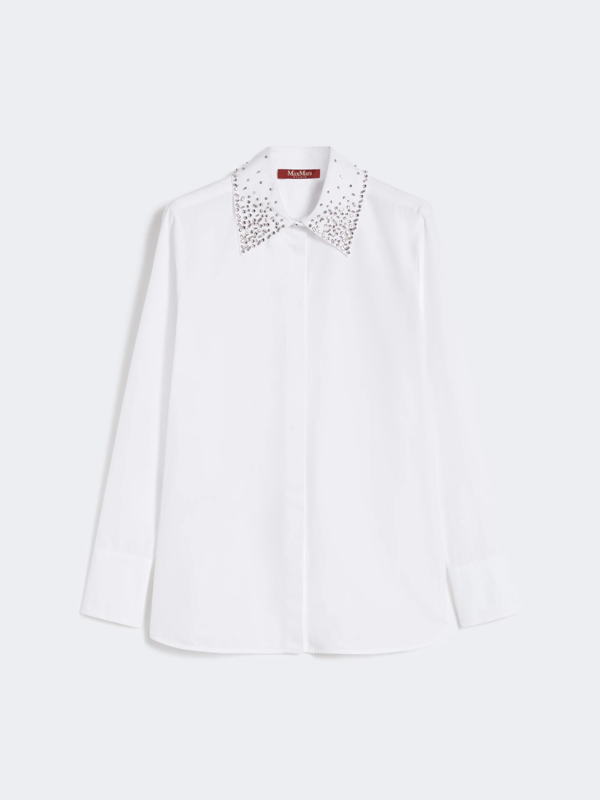 DETAILS Masculine-cut poplin shirt embellished with crystals and jewel buttons. Refined design and sophisticated details characterise this essential silhouette. Pure cotton poplin shirt Straight fit Classic pointed collar adorned with faceted crystals Set-in sleeves with button detail on the side of the cuffs Concealed front fastening featuring jewel buttons Max Mara Studio logo positioned on the front hem COMPOSITION AND CARE Fabric 100% cotton; - exclusive of decoration. Hand wash cold (40°c max); do not bleach; do not tumble dry; line drying in the shade; cool iron; do not dry clean; do not wet clean.; wash the garment while it is fastened.; do not iron the buttons.; turn the articles inside out before washing.; contains non-textile parts of animal origin. Distributed by Max Mara S.r.l., registered office in Reggio Emilia (Italy), Via Giulia Maramotti 4, 42124 (IT)