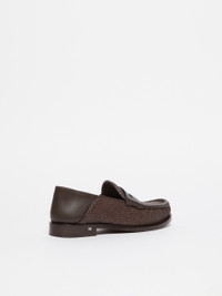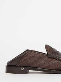DETAILS Loafers made from a raffia-effect fabric with soft natural calf leather details treated with a semi-gloss finish and an unevenly dyed effect. The design includes a folding leather heel, allowing them to be worn as sabots. Finished with classic raised stitching on the upper, a vamp across the instep, and a heel adorned with a small M Monogram logo on the side. Nappa-leather lining and leather sole. COMPOSITION AND CARE Upper in 60% polyamide, 40% cotton; with details in calf; lining in lamb leather; sole in leather. Distributed by Max Mara S.r.l., registered office in Reggio Emilia (Italy), Via Giulia Maramotti 4, 42124 (IT)