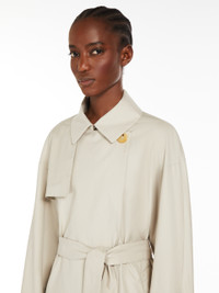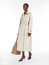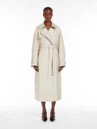 DETAILS Long double-breasted trench coat in water-repellent technical cotton twill fabric featuring a shirt collar, welt side pockets and a central rear vent. Set-in front sleeves and kimono back sleeves with adjustable cuff tab detail. Embellished with an asymmetrical detached yoke on the front right-hand side and a waistline-accentuating matching belt. The model is half-lined in taffeta fabric and branded jacquard ribbon detail. Horn button fastening. This garment’s main fabric comprises natural fibres grown according to the organic farming standards. COMPOSITION AND CARE Fabric 66% cotton, 34% polyester; lining 100% polyester. Machine wash cold delicate cycle; do not bleach; do not tumble dry; line drying in the shade; cool iron; professionally dry clean perchloroethylene - mild process.; wash the garment while it is fastened.; don’t iron the labels.; do not iron the buttons.; protect buttons before washing.; turn the articles inside out before washing.; contains non-textile parts of animal origin. Distributed by Max Mara S.r.l., registered office in Reggio Emilia (Italy), Via Giulia Maramotti 4, 42124 (IT)