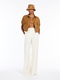 DETAILS Cropped jacket with a boxy cut, made of stretch cotton double-cloth canvas. Featuring a shirt collar, elbow-length sleeves with a cuff and button, dropped shoulders and large patch pockets on the front with leather straps. Lined, visible button fastening. COMPOSITION AND CARE Fabric 95% cotton, 5% elastane; lining 56% viscose, 44% cotton; with details in cattle. Do not wash; do not bleach; do not tumble dry; cool iron; professionally dry clean perchloroethylene - mild process; do not wet clean.; wash the garment while it is fastened.; do not wash or dry clean by fabric methods. clean only by leather and fur specialists.; do not iron the real leather details.; do not iron the buttons.; turn the articles inside out before washing.; contains non-textile parts of animal origin. Distributed by Max Mara S.r.l., registered office in Reggio Emilia (Italy), Via Giulia Maramotti 4, 42124 (IT)