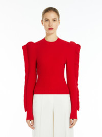 DETAILS Crew-neck jumper made of stretch viscose yarn in a rice grain stitch knit. The garment features a fitted silhouette, slightly cropped to the waist and wide frills inserted on the sleeves. Ribbed trim. COMPOSITION AND CARE Knitted fabric 62% viscose, 38% polyester; fabric 100% polyamide. Hand wash cold; do not bleach; do not tumble dry; flat drying in the shade; cool iron; professionally dry clean perchloroethylene - mild process; do not wet clean.; iron with a cloth between.; using neutral detergent. Distributed by Max Mara S.r.l., registered office in Reggio Emilia (Italy), Via Giulia Maramotti 4, 42124 (IT)