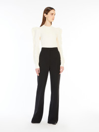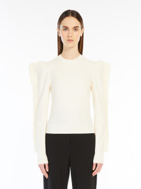 DETAILS Crew-neck jumper made of stretch viscose yarn in a rice grain stitch knit. The garment features a fitted silhouette, slightly cropped to the waist and wide frills inserted on the sleeves. Ribbed trim. COMPOSITION AND CARE Knitted fabric 62% viscose, 38% polyester; fabric 100% polyamide. Hand wash cold; do not bleach; do not tumble dry; flat drying in the shade; cool iron; professionally dry clean perchloroethylene - mild process; do not wet clean.; iron with a cloth between.; using neutral detergent. Distributed by Max Mara S.r.l., registered office in Reggio Emilia (Italy), Via Giulia Maramotti 4, 42124 (IT)