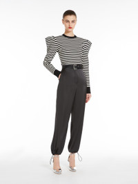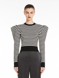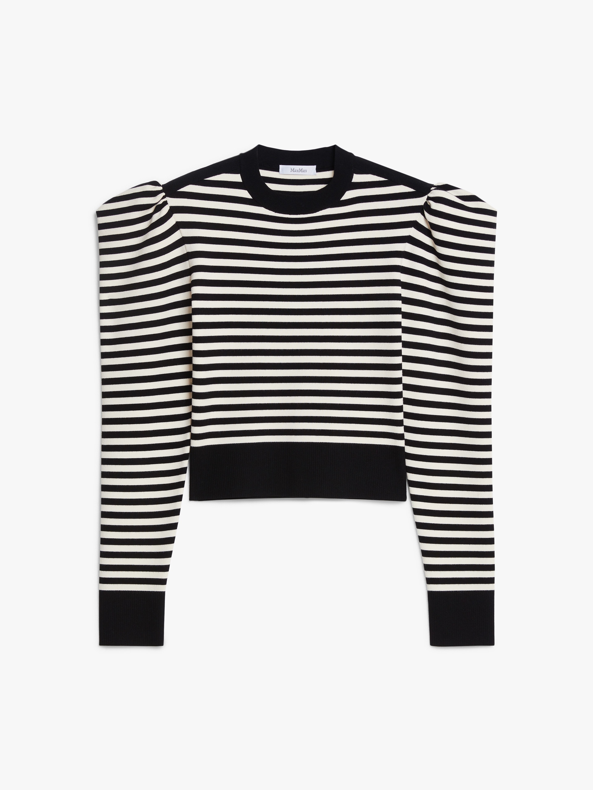 DETAILS Crew-neck jumper in soft stretch viscose knit, with all-over striped pattern. The garment features long sleeves with wide puffed shoulders. Features a solid colour ribbed collar, cuffs and edge. COMPOSITION AND CARE Knitted fabric 62% viscose, 38% polyester; fabric 100% polyamide; hems 47% viscose, 28% polyester, 20% polyamide, 5% elastane. Hand wash cold; do not bleach; do not tumble dry; flat drying in the shade; cool iron; professionally dry clean perchloroethylene - mild process; do not wet clean.; iron with a cloth between.; using neutral detergent. Distributed by Max Mara S.r.l., registered office in Reggio Emilia (Italy), Via Giulia Maramotti 4, 42124 (IT)