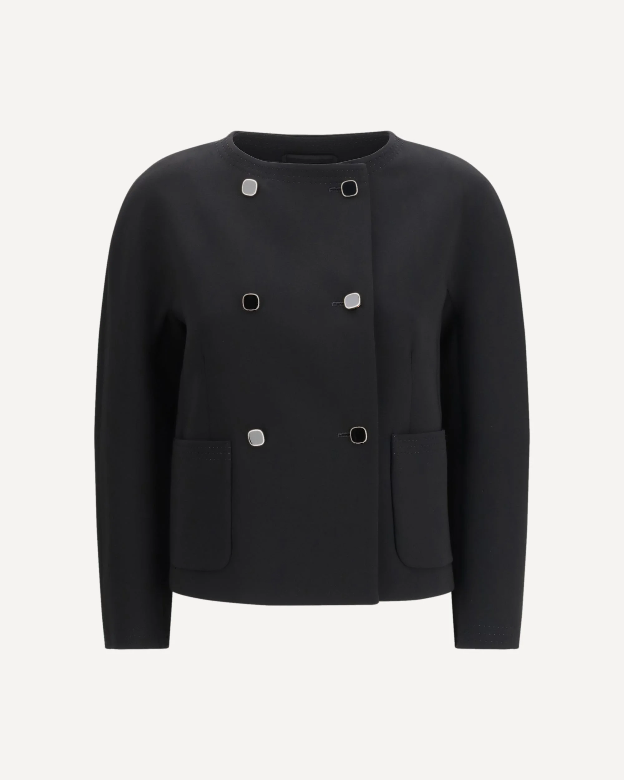 The boxy cady Jacket by Max Mara Studio delivers a contemporary elegance defined by bold, modern lines. This cropped design features a boxy silhouette with a round neckline and long kimono sleeves, creating refined volume. A six-button front closure structures the jacket, while front patch pockets add a functional touch. Finished with contrasting triple topstitching and fully lined, it combines tailored craftsmanship with clean, modern style. DETAILS - Sku: 2616041015600_001 - Season: SS26 - Fit: Regular - Composition: OUTER 71% Triacetate 29% Polyester INNER 70% Acetate 30% Polyester - MADE IN ITALY