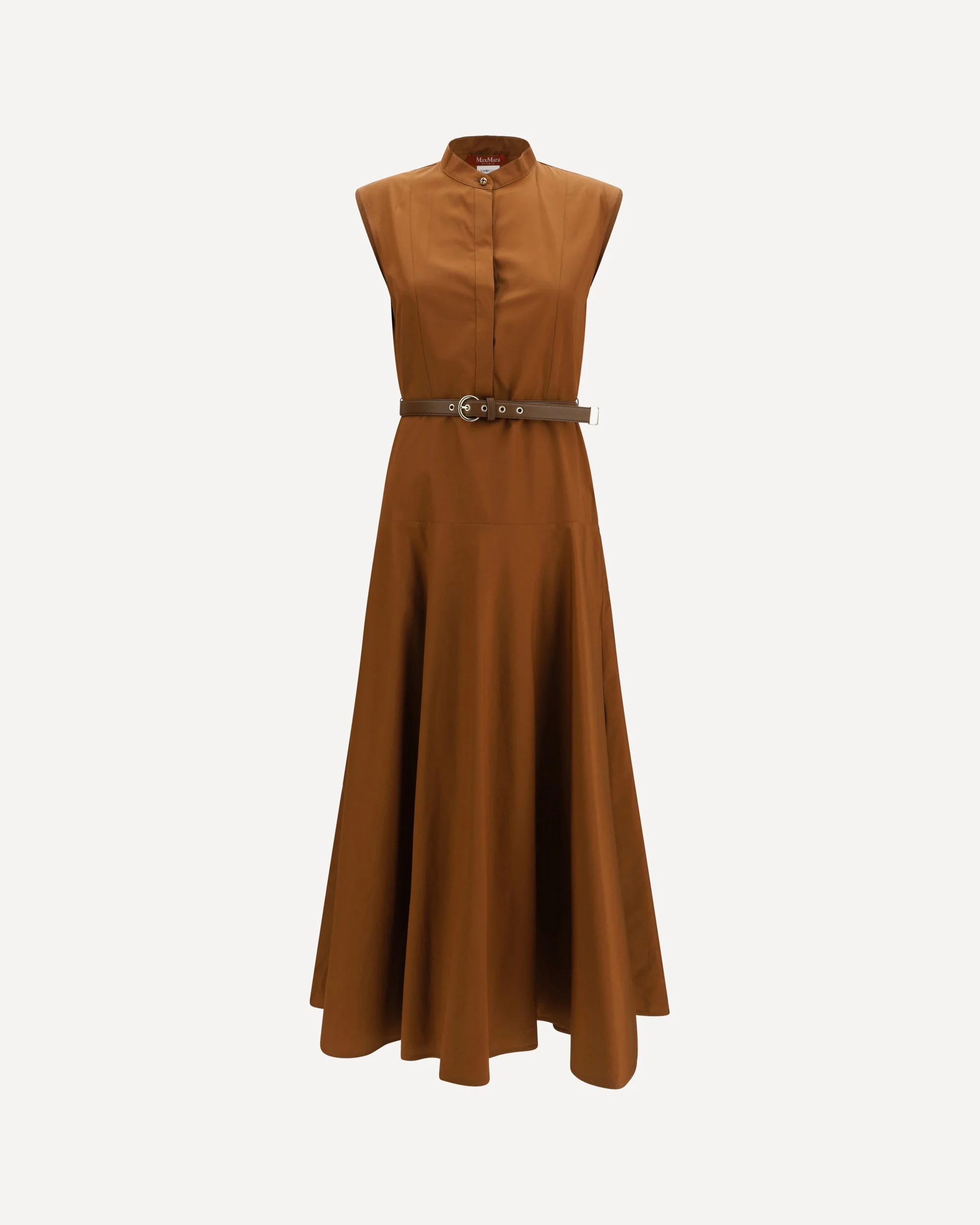 The cotton poplin fit-and-flare Dress by Max Mara Studio is a sleeveless long dress crafted from pure cotton. The design features a mandarin collar, strap-style cut details on the bodice, and a cut-out detail on the back. The fit-and-flare silhouette with a matching belt at the waist enhances the figure, while the full circular skirt with peplum detail at the hips adds movement. The style is completed with a concealed front closure at the bodice, an invisible side zip on the left, side seam pockets, and full lining. DETAILS - Sku: 2616221052600_070 - Season: SS26 - Fit: Regular - Composition: GENERAL 100% Cotton - MADE IN PORTUGAL