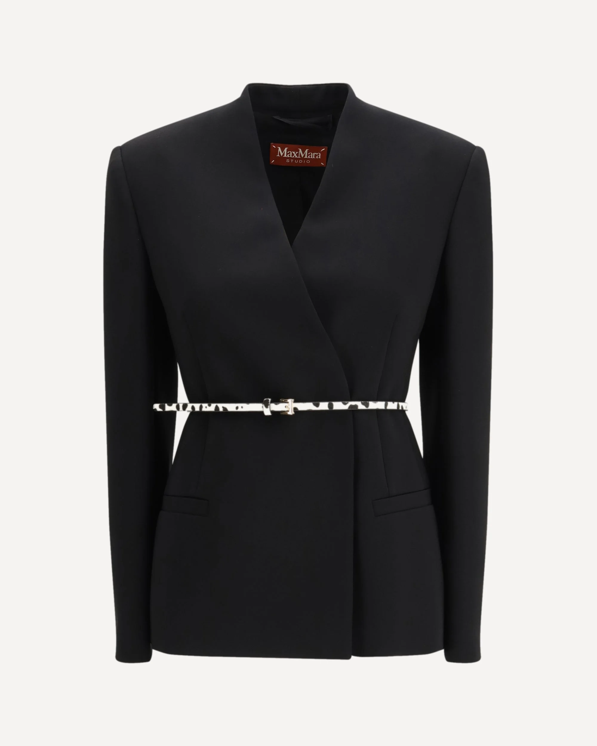 The double-breasted cady Jacket by Max Mara Studio delivers contemporary elegance with a tailored sensibility. Defined by a shaped silhouette, it features a standing collar and set-in sleeves with side slits, adding structure and refinement to the design. A concealed snap-button fastening ensures a clean, streamlined look, while horizontal welt pockets at the front provide discreet functionality. The jacket is enhanced by a cinched waist with stitched detailing and a slim matching suede-effect belt, elegantly defining the waist. Fully lined for comfort and a polished fit. DETAILS - Sku: 2616041035600_001 - Season: SS26 - Fit: Regular - Composition: GENERAL 71% Triacetate 29% Polyester - MADE IN POLAND