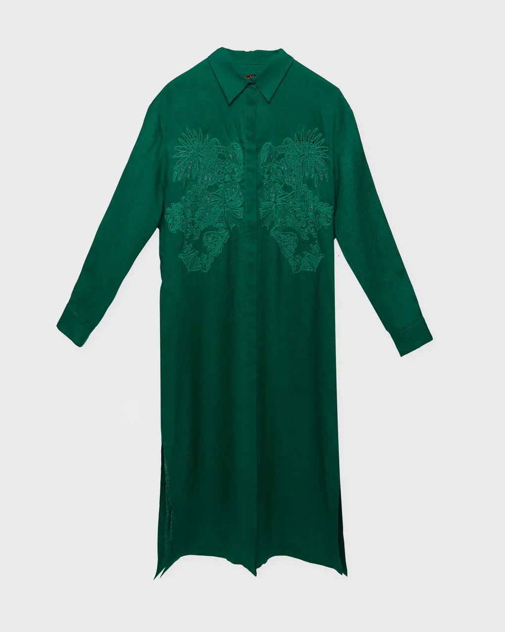 Dress Megaton from Max Mara. This sleek green shirt dress combines elegance with a relaxed style. Embroidered flowers on the chest and buttons in the same green shade add a subtle, sophisticated touch. The airy and cool fit makes it perfect for warm days, while the relaxed silhouette offers both comfort and style in one. Size and Fit - Fits true to size, choose your usual size - The model is 176 cm tall and is wearing IT 40 Specification - Article number - ID: 175337-754 - Brand: MaxMara - Color: Emerald