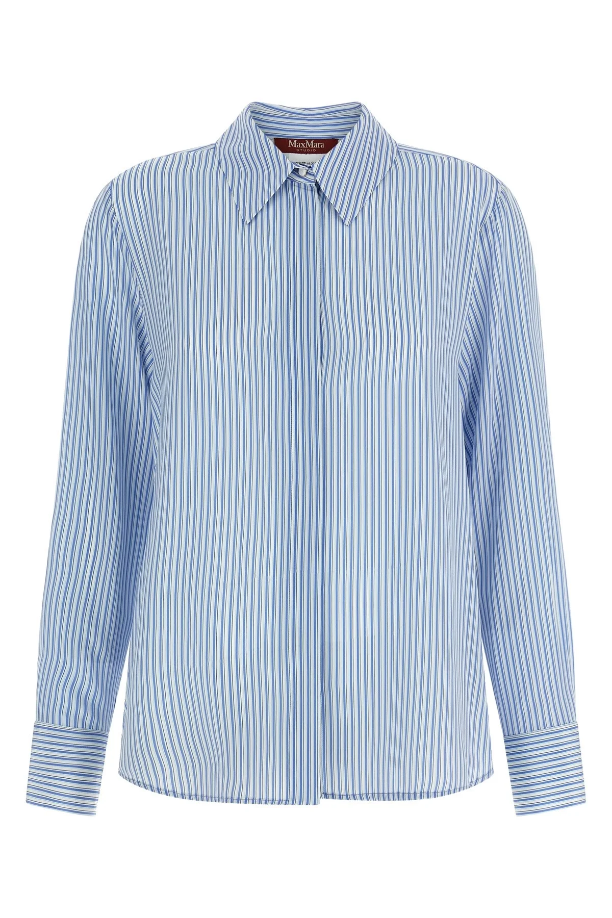 cod. 2616111011600003 'Mstflirt' crepe de chine silk shirt with all-over striped print, masculine cut with pointed collar, front closure with concealed buttons, back central crease, side slits, long sleeves with double enameled metal button cuffs. Color: Light Blue Size & Fit: True to size fit Composition: 100% silk Made in: Romania