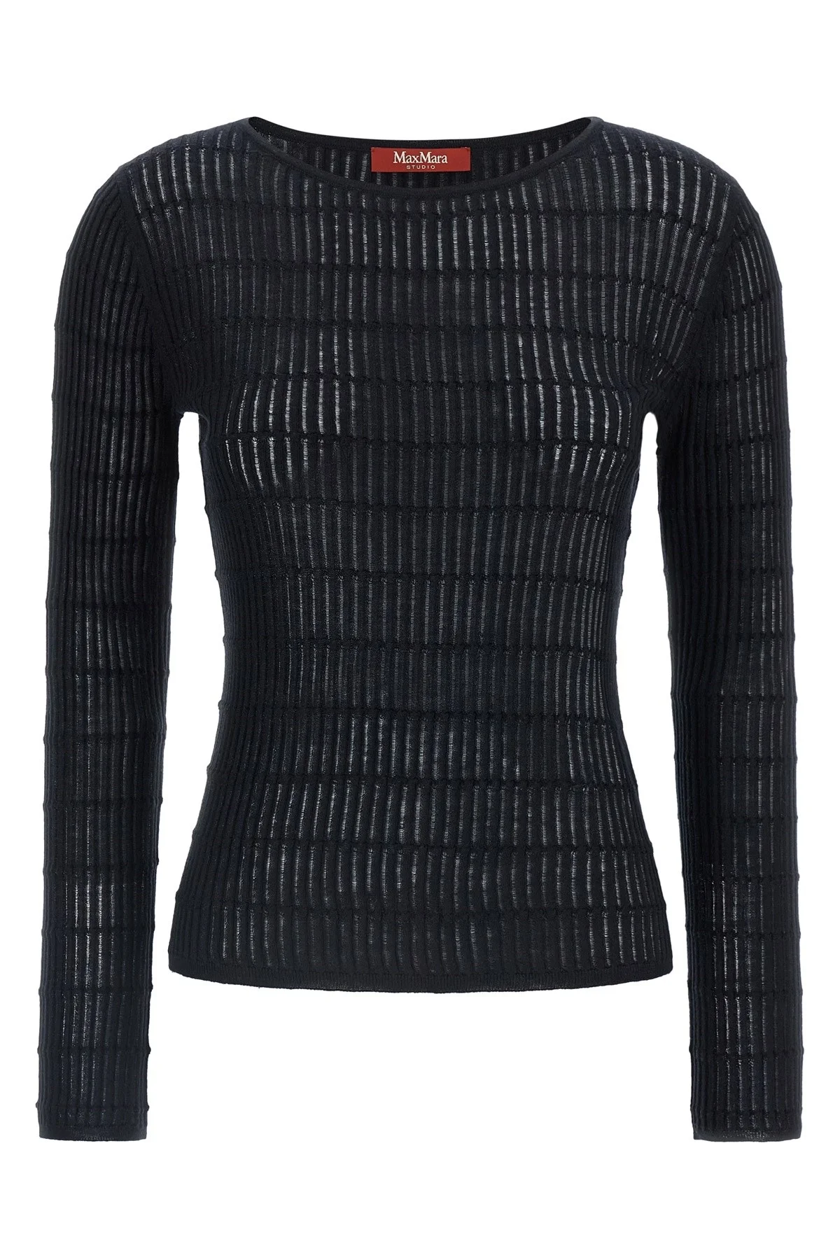 cod. 2616361061600008 'MstPedone' flat ribbed wool and silk yarn sweater with a jour details, boat neck, long sleeves. Color: Blue Size & Fit: Slim fit Composition: 55% silk, 45% wool Made in: China