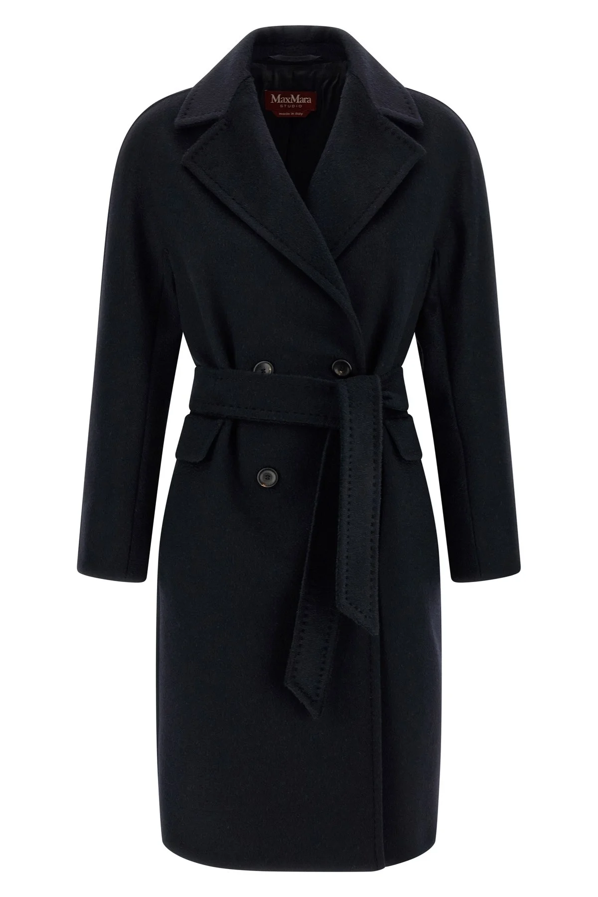 cod. 2526016092600030 'Panteon' midi coat in pure cashmere, alpaca and wool sable drap with double-breasted button closure and lapel collar, pockets, long kimono sleeves, viscose lining, removable belt. Color: Blue Size & Fit: true to size fit Composition: 40% ws, 30% wp, 30% wv Made in: Italy