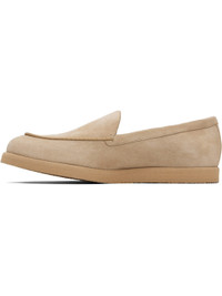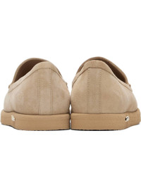 Goatskin suede slip-on loafers. · Moc toe · Strap at vamp · Lambskin nubuck and satin lining · Logo hardware at outer side · Crepe-rubber sole Supplier color: Camel Upper: goatskin. Sole: rubber. Made in Italy 252118F121000