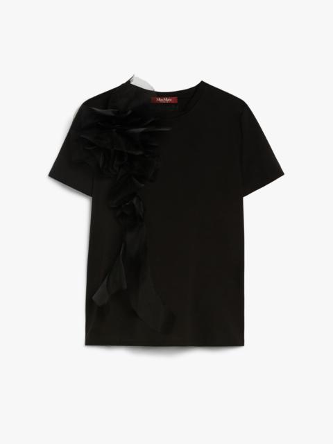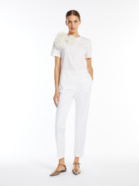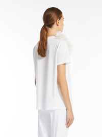 DETAILS Short-sleeved crew-neck couture T-shirt in soft pure cotton jersey fabric. The front of the model is embellished with press stud-removable asymmetrical floral embroidery to make the garment easy to wash. The back of the neck is embellished with rhinestone-embroidered Max Mara Studio logo detail. COMPOSITION AND CARE Jersey fabric 100% cotton; fabric 100% silk; - exclusive of decoration. Hand wash cold; do not bleach; do not tumble dry; flat drying in the shade; cool iron; do not dry clean; do not wet clean.; iron with a cloth between.; using neutral detergent.; before cleaning the style remove the accessories.; don’t rub.; turn the articles inside out before washing.; to be ironed on reverse. Distributed by Max Mara S.r.l., registered office in Reggio Emilia (Italy), Via Giulia Maramotti 4, 42124 (IT)