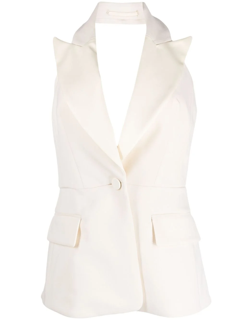 suit style virgin wool top Highlights - Cream white - Stretch-wool - Satin trim - Notched lapels - Sleeveless - Front button fastening - Two side flap pockets - Straight hem - Square open back Made in Italy Composition Outer: Polyester 100%, Wool 98%, Elastane 2% Lining: Acetate 70%, Cupro 30% SIZE & FIT Model measurements Height 5 ft 10 in(1.78 m) Bust/Chest 32.67 in(83 cm) Hips 35.43 in(90 cm) Waist 23.22 in(59 cm) FittingInformation Designed for a slim fit that sits just away from the body offering a close yet comfortable fit The vented hem offers movement at the rear Made from a midweight fabric This piece fits true to size – take your usual size Washing instructions Dry Clean Only