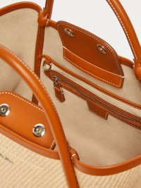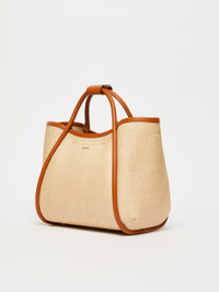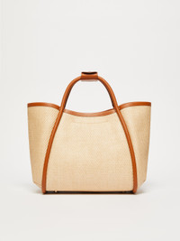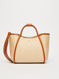 DETAILS Small-sized Marine bag in raffia-look woven fabric featuring smooth leather details. The exclusive creation is made distinctive by its rounded shape and versatile dimensions, thanks to the strap-securing extendable sides and split ring on the inside. Comes with iconic tubular handles, complete with handle-securing loop detail, plus a removable and adjustable shoulder strap for handheld, shoulder or crossbody use. The soft-textured interior is fitted with an internal split ring for attaching small leather goods, in addition to a zipped pocket on one side and a trim-decorated open pocket on the other. Embellished with a metal Max Mara lettering applique on the front and 5 metal bag feet. Magnetic snap fastening at the top. COMPOSITION AND CARE Handbag in 100% polyamide; with details in cattle; lining in 55 polyurethane, 45 nylon,. Do not wash; do not bleach; do not tumble dry; do not iron; do not dry clean; do not wet clean. Distributed by Max Mara S.r.l., registered office in Reggio Emilia (Italy), Via Giulia Maramotti 4, 42124 (IT)