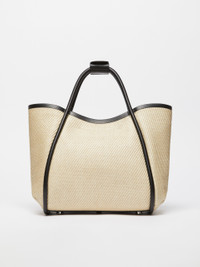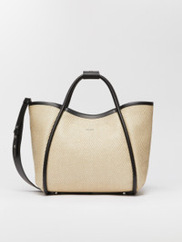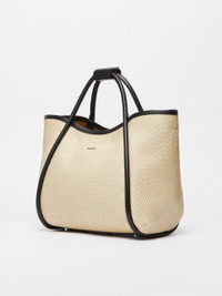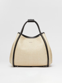 DETAILS Small-sized Marine bag in raffia-look woven fabric featuring smooth leather details. The exclusive creation is made distinctive by its rounded shape and versatile dimensions, thanks to the strap-securing extendable sides and split ring on the inside. Comes with iconic tubular handles, complete with handle-securing loop detail, plus a removable and adjustable shoulder strap for handheld, shoulder or crossbody use. The soft-textured interior is fitted with an internal split ring for attaching small leather goods, in addition to a zipped pocket on one side and a trim-decorated open pocket on the other. Embellished with a metal Max Mara lettering applique on the front and 5 metal bag feet. Magnetic snap fastening at the top. COMPOSITION AND CARE Handbag in 100% polyamide; with details in cattle; lining in 55 polyurethane, 45 nylon,. Do not wash; do not bleach; do not tumble dry; do not iron; do not dry clean; do not wet clean. Distributed by Max Mara S.r.l., registered office in Reggio Emilia (Italy), Via Giulia Maramotti 4, 42124 (IT)