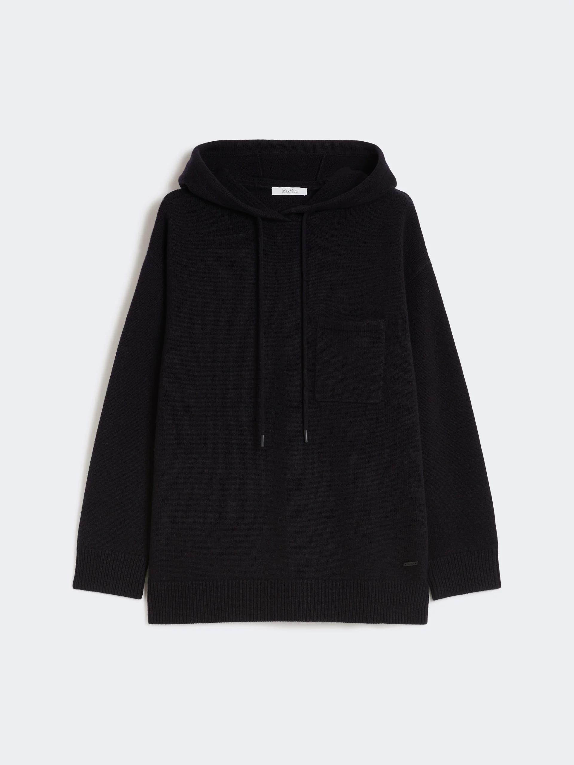 DETAILS Hooded sweatshirt with drawstring and tone-on-tone enamelled metal ends. Wool and cashmere plain-knit sweatshirt Long sleeves with dropped shoulders Chest patch pocket, left side as worn Ribbed cuffs and hem Logo plate at the front hem COMPOSITION AND CARE 70% wool, 30% cashmere. Hand wash cold (40°c max); do not bleach; do not tumble dry; flat drying in the shade; cool iron; professionally dry clean perchloroethylene - mild process; do not wet clean.; iron with a cloth between.; using neutral detergent. Distributed by Max Mara S.r.l., registered office in Reggio Emilia (Italy), Via Giulia Maramotti 4, 42124 (IT)