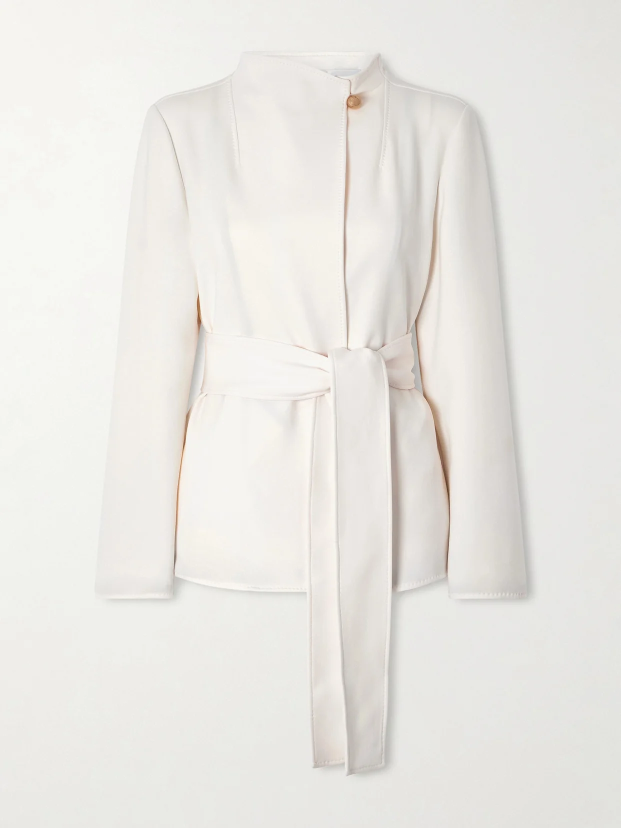 This Max Mara jacket brings sculptural poise to everyday dressing. It's made from scuba with a stand collar and cinches with a wide sash belt. Complement the gold-tone button with earrings.