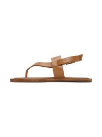 Buffed leather flat sandals in tan. · Open toe · Thong-style strap at vamp · Pin-buckle ankle strap · Logo-embossed padded lambskin footbed · Stacked leather midsole · Rubber sole · Contrast topstitching in white Supplier color: Tobacco Upper: leather, lambskin. Sole: rubber. Made in Italy 241118F124003