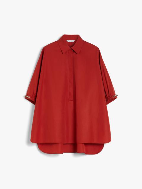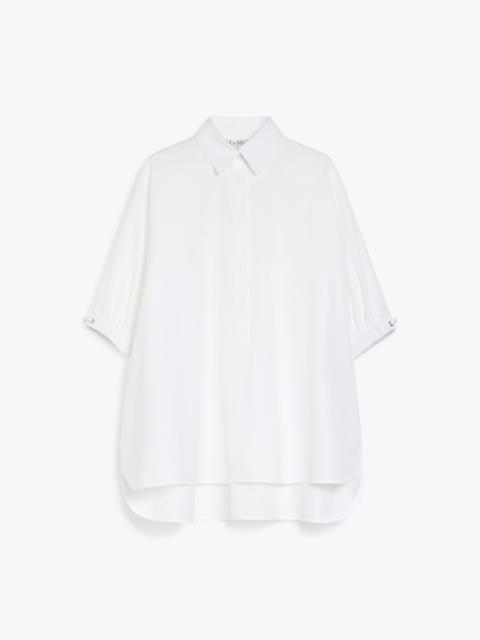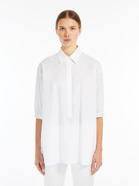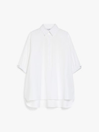 DETAILS Loose-fitting shirt in pure cotton poplin with a polo-style collar and yoke cut on the back. The style features 3/4 sleeves and stretch cuffs with metal eyelets and a drawstring at the sides. Asymmetrical hem, slightly longer at the back, with side slits. Concealed button fastening. COMPOSITION AND CARE Fabric 100% cotton; - exclusive of decoration. Machine wash cold delicate cycle; do not bleach; do not tumble dry; line drying in the shade; cool iron; professionally dry clean perchloroethylene - mild process.; do not iron the buttons.; turn the articles inside out before washing. Distributed by Max Mara S.r.l., registered office in Reggio Emilia (Italy), Via Giulia Maramotti 4, 42124 (IT)